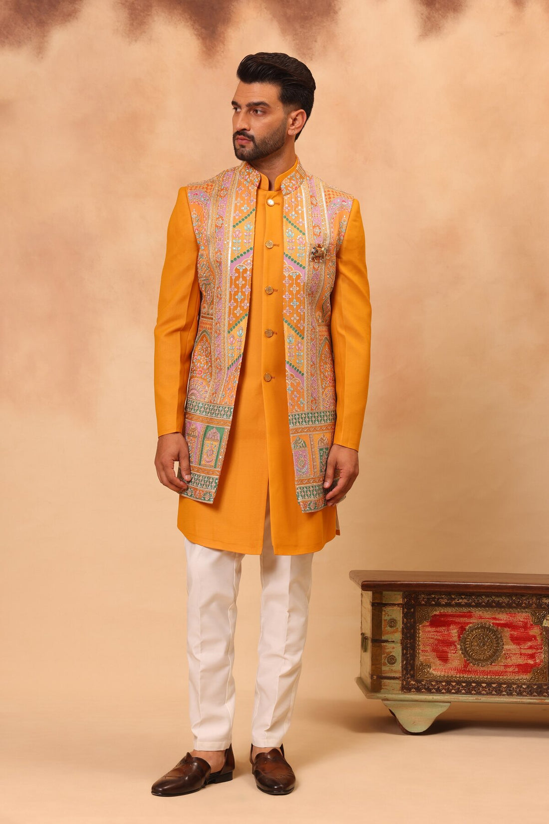 Components: 4 Colour: Haldi Fit: Regular Fit Neckline: Mandarin Collar Sleeve: Full Sleeves Sherwani; Full...