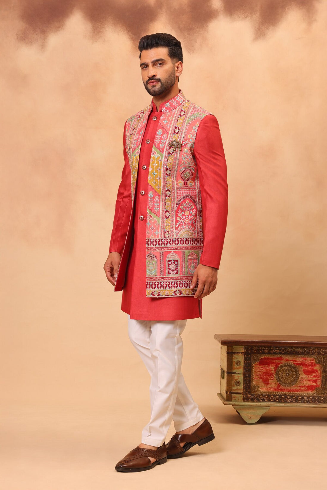 Components: 4 Colour: Red Fit: Regular Fit Neckline: Mandarin Collar Sleeve: Half Sleeves Jacket; Full...