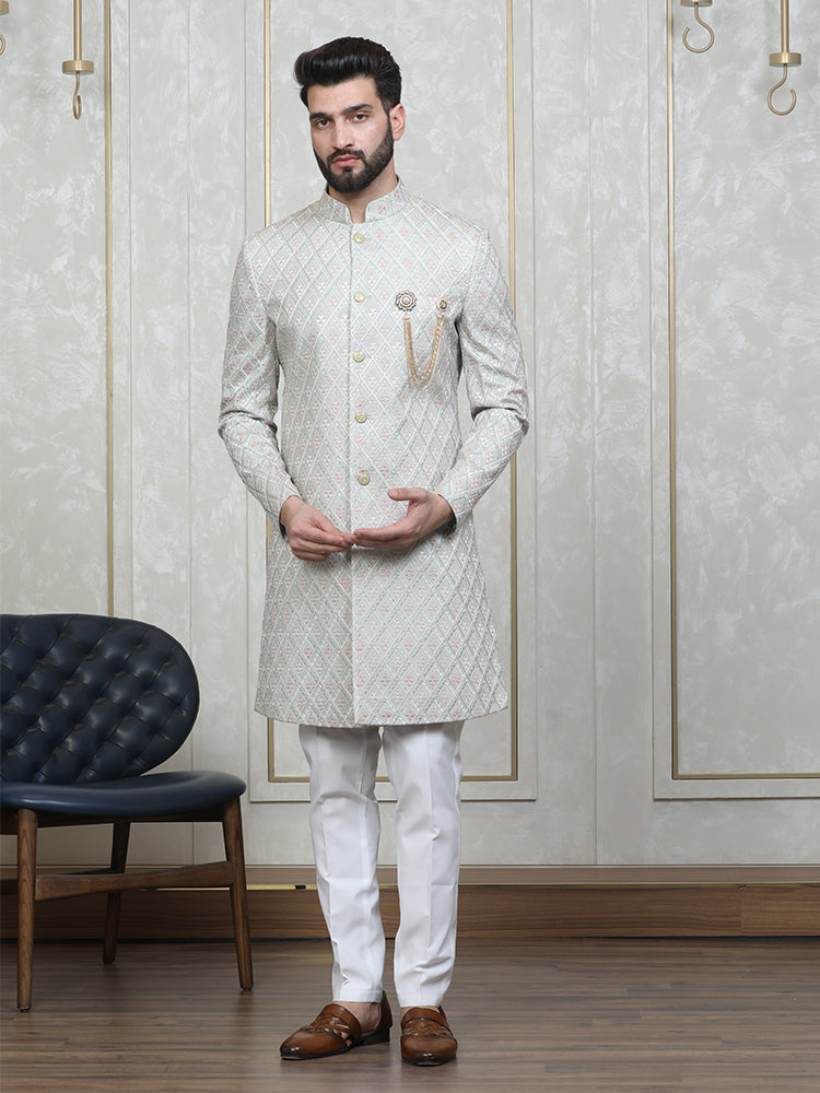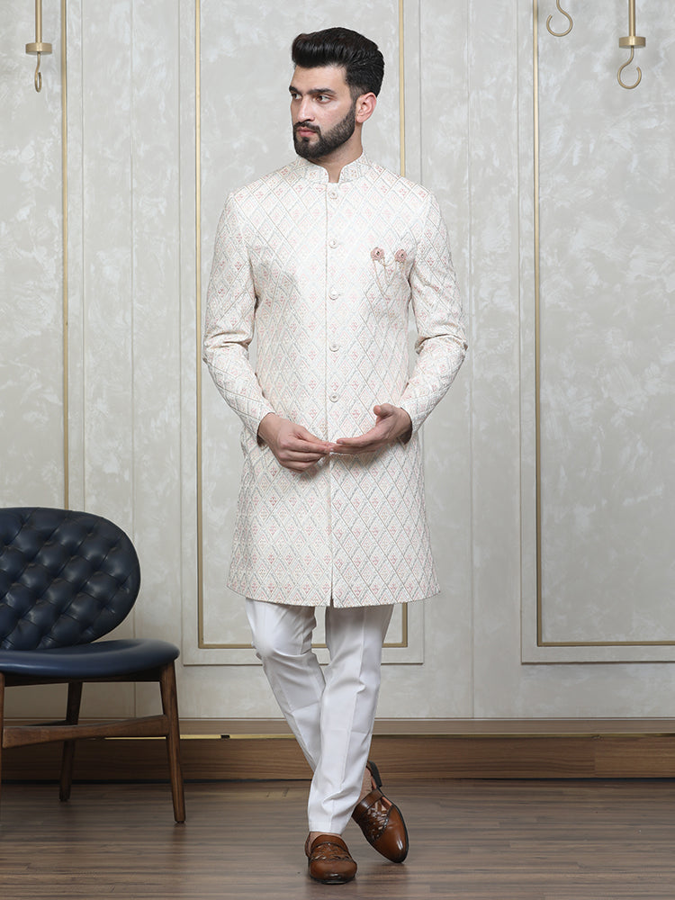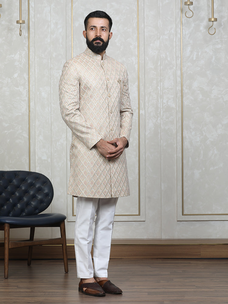 Cream Velvet Embroidered Sherwani Set with Dupatta