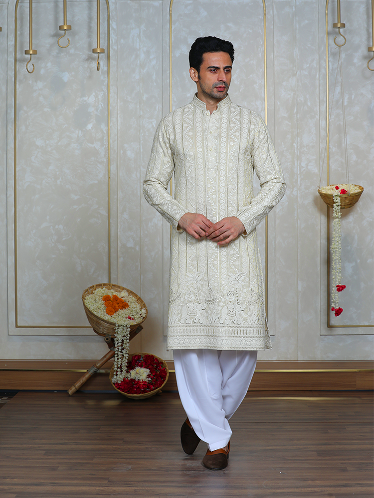 Mouse Silk Thread Embroidered Kurta Set for Men