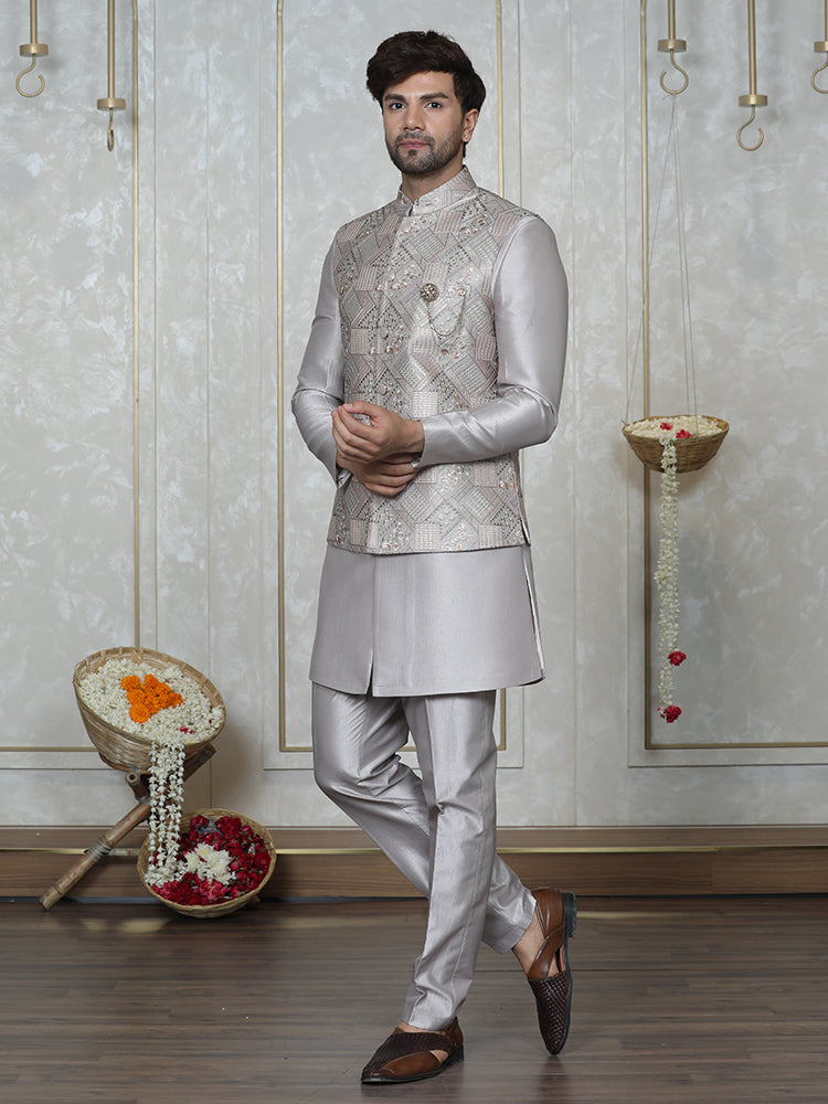 Silver Grey Embroidered Nehru Jacket Set with Foil Work