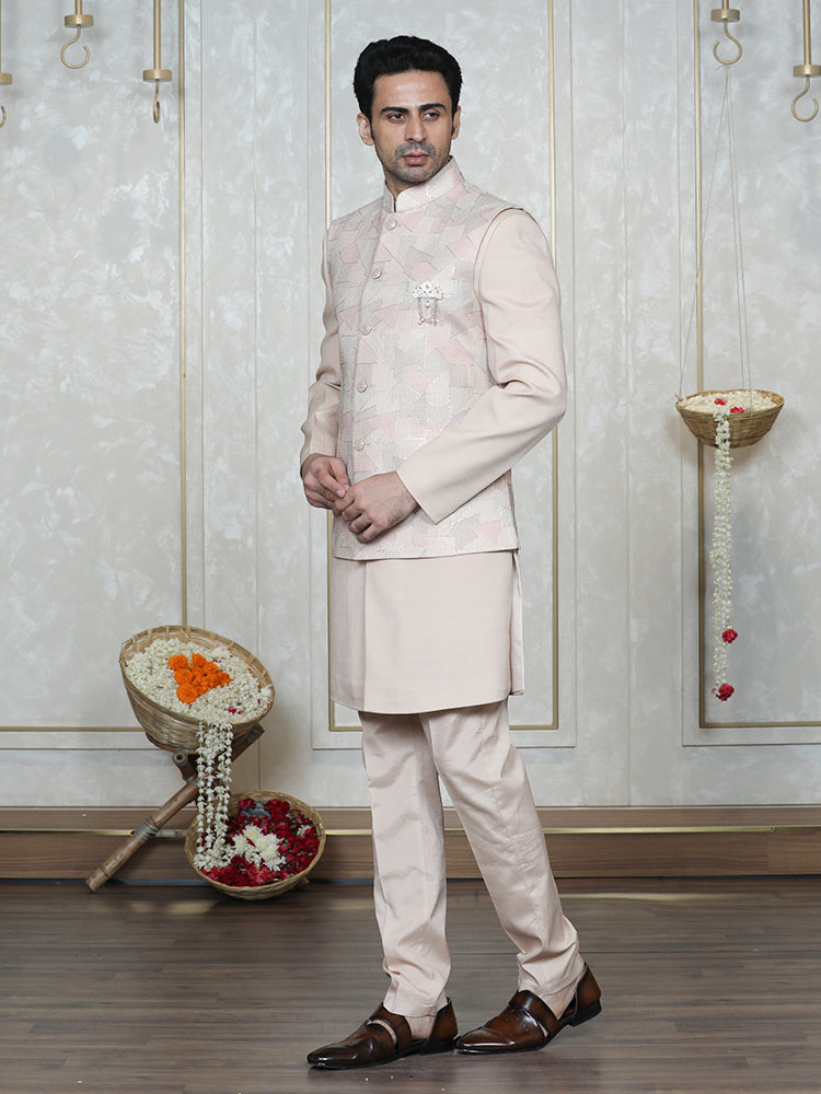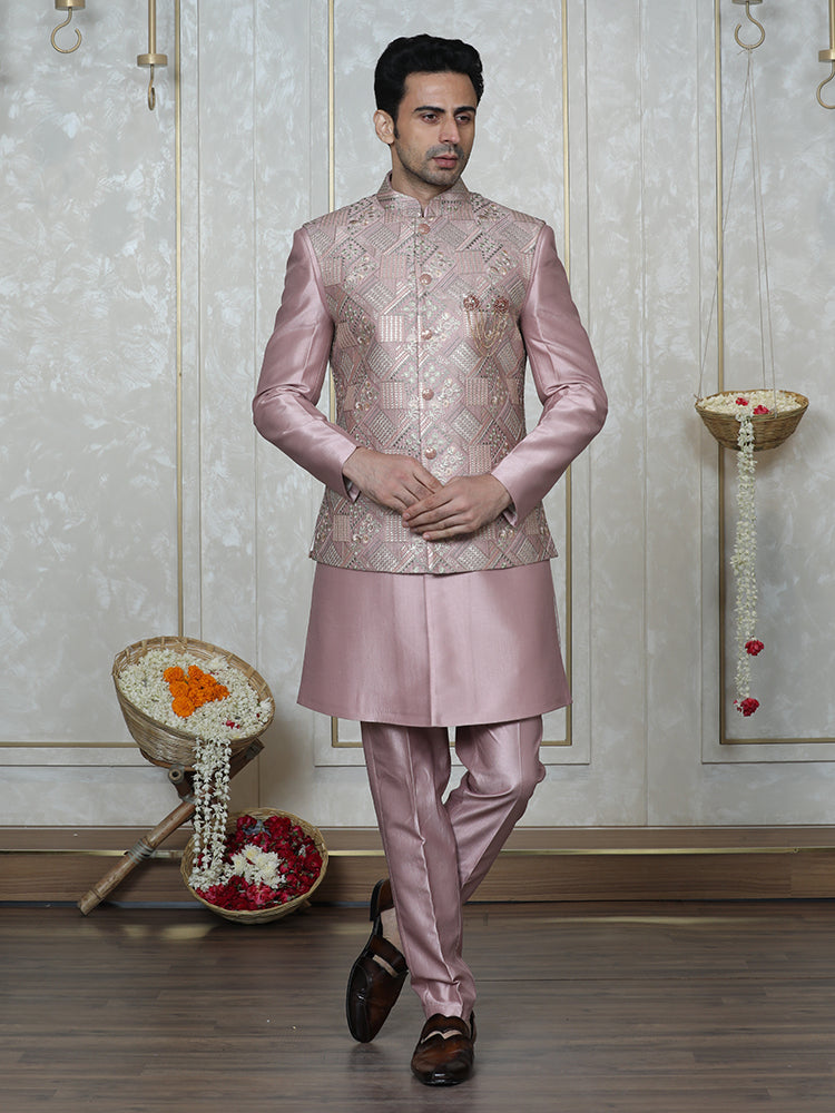 Onion Pink Embroidered Nehru Jacket Set with Foil Work