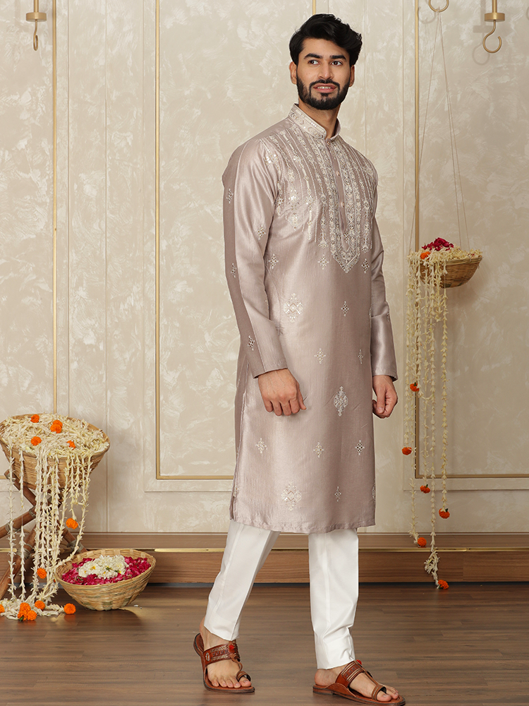 Mauve Silk Thread Embroidered Kurta Set for Men