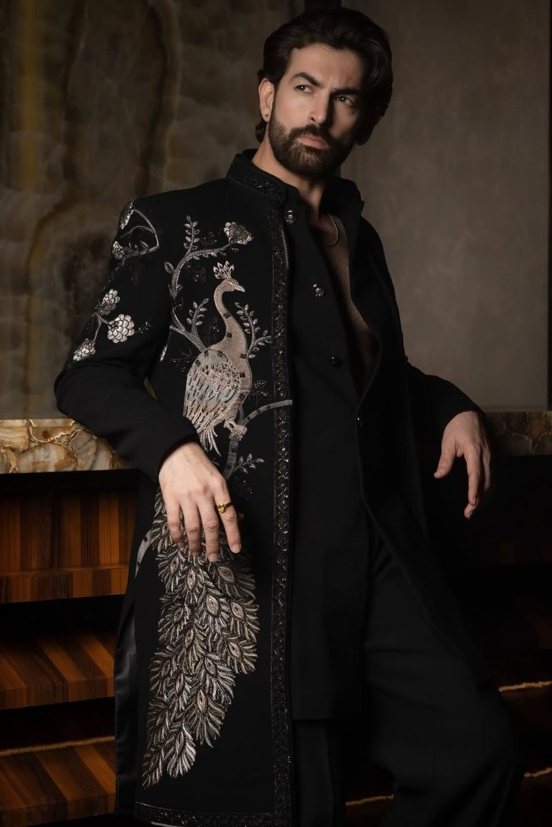 Black Embroidered Front Open Sherwani Jacket Set
