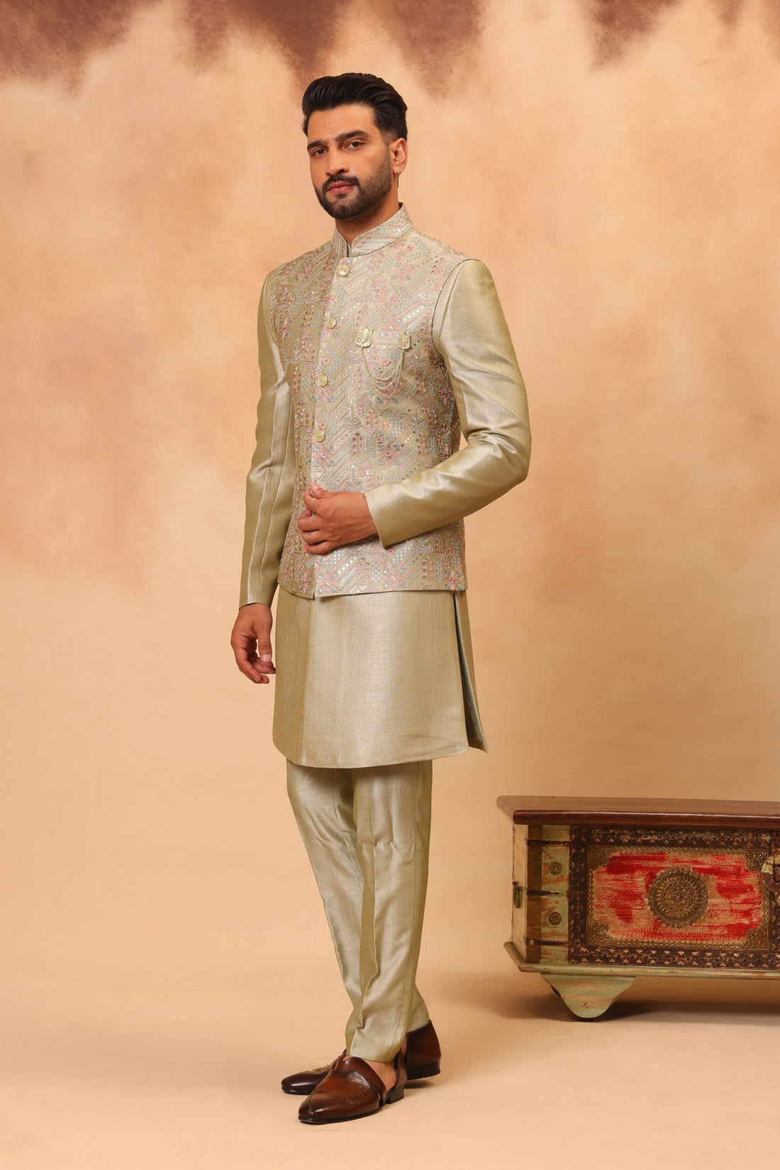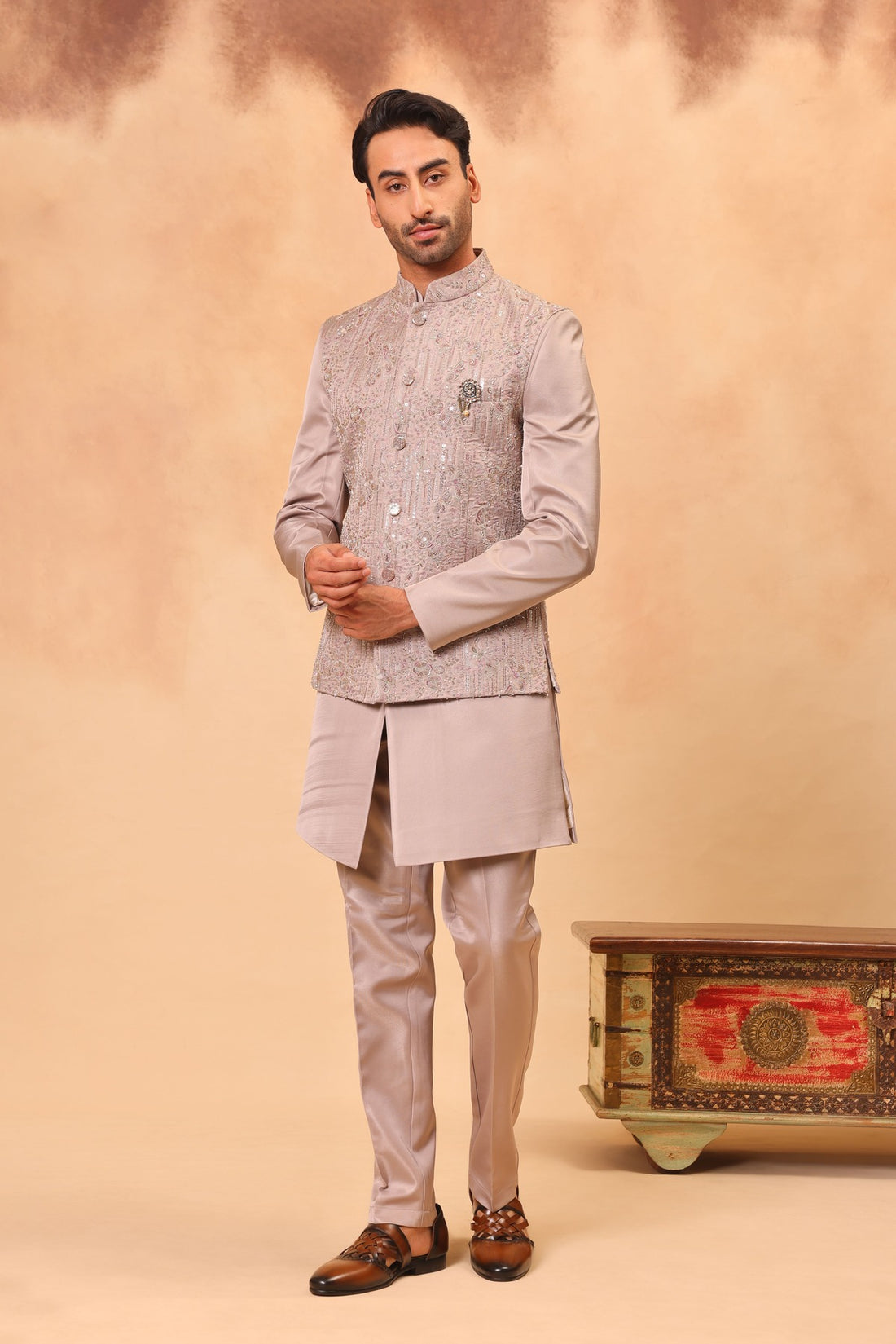 Mouse Grey Cutdana Work Embroidered Nehru Jacket Set