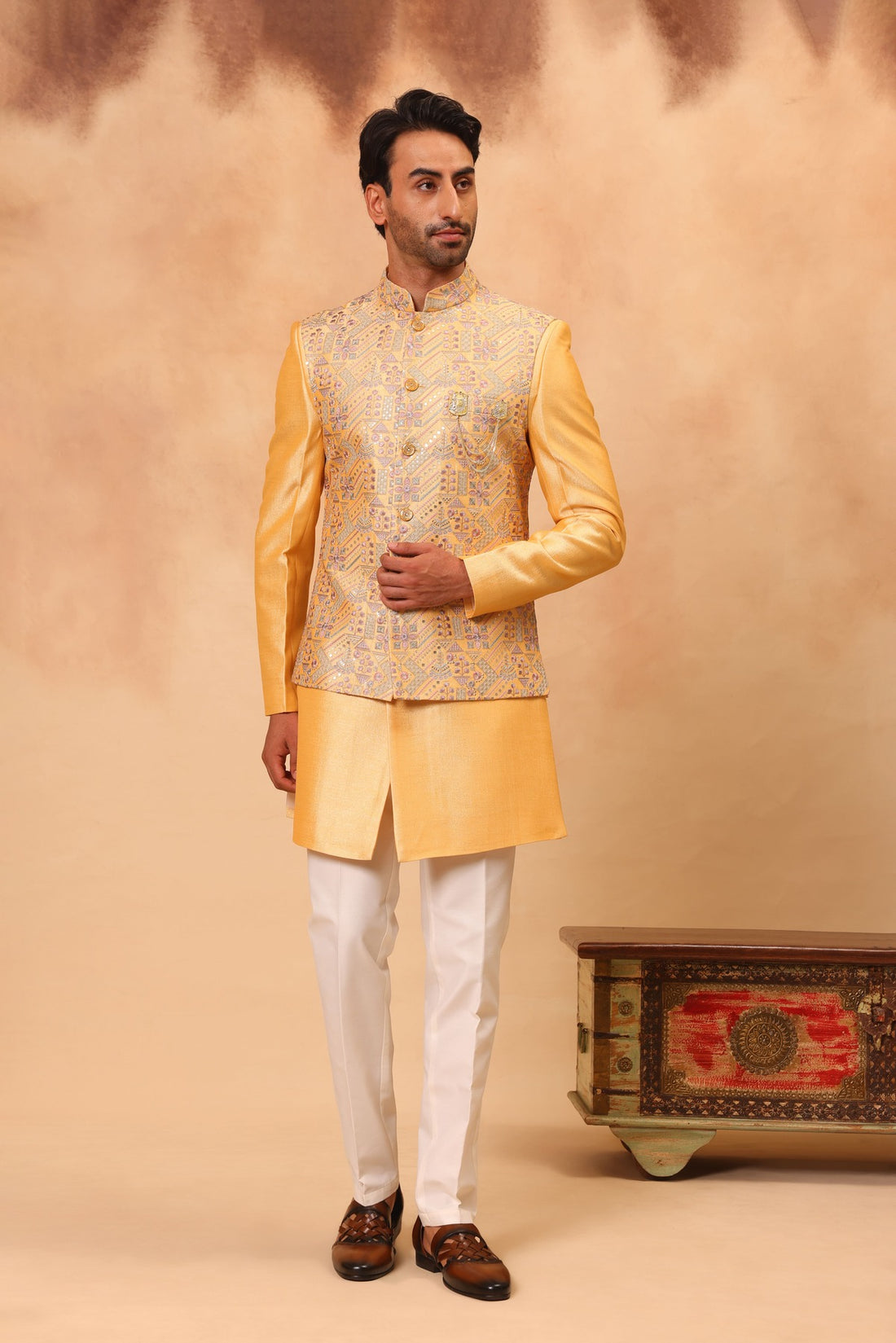 Components: 3 Colour: Haldi Yellow Fit: Regular Fit Neckline: Mandarin Collar Sleeve: Full Sleeves Fabric:...