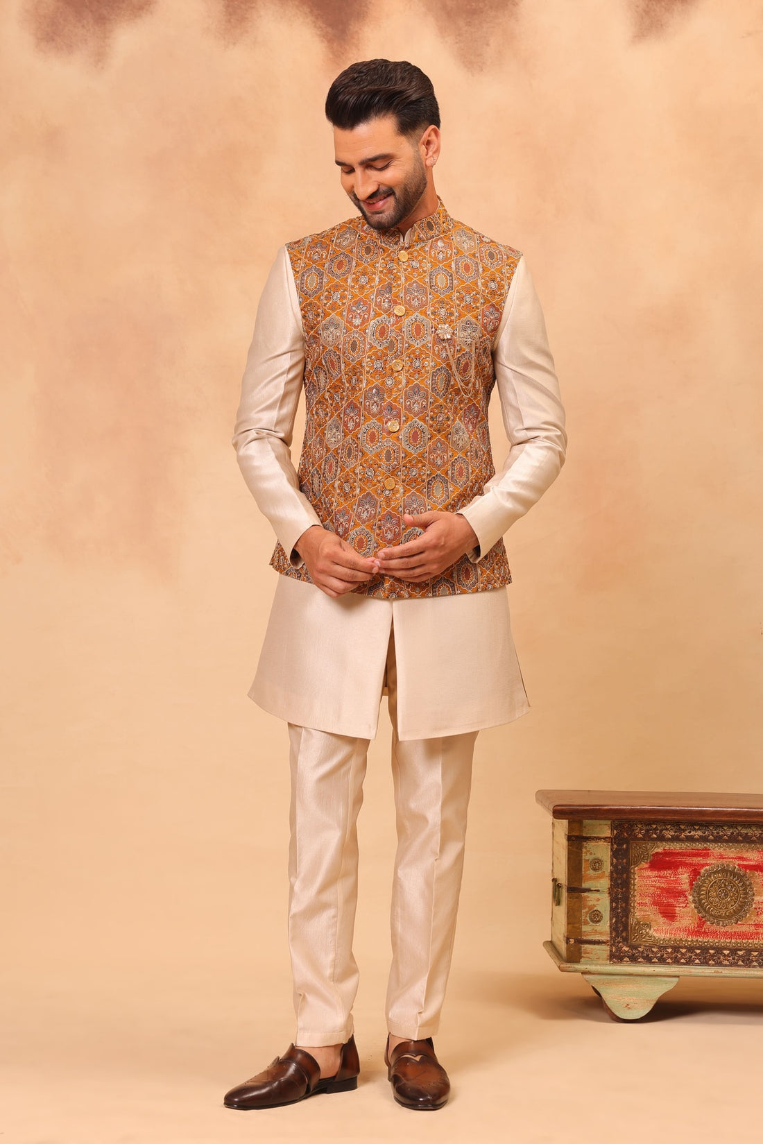 Components: 3 Colour: Cream Fit: Regular Fit Neckline: Mandarin Collar Sleeve: Full Sleeves Jodhpuri Fabric:...