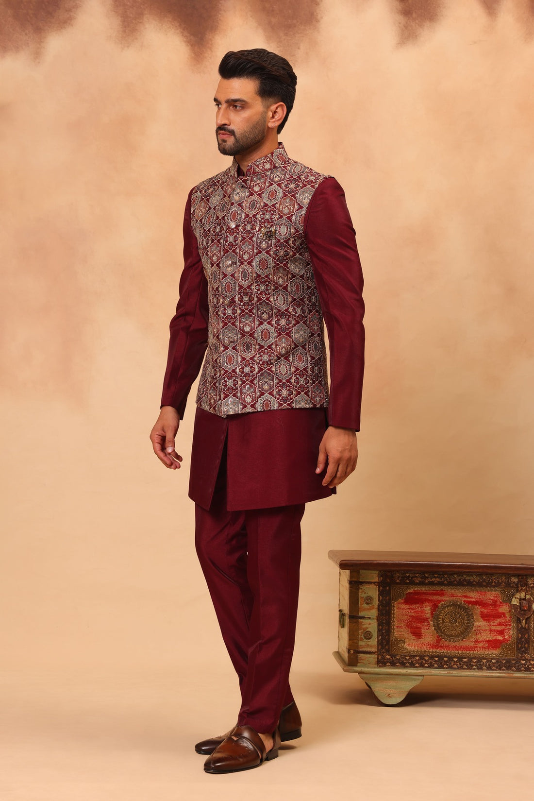 Components: 3 Colour: Wine Fit: Regular Fit Neckline: Mandarin Collar Sleeve: Full Sleeves Jodhpuri Fabric:...