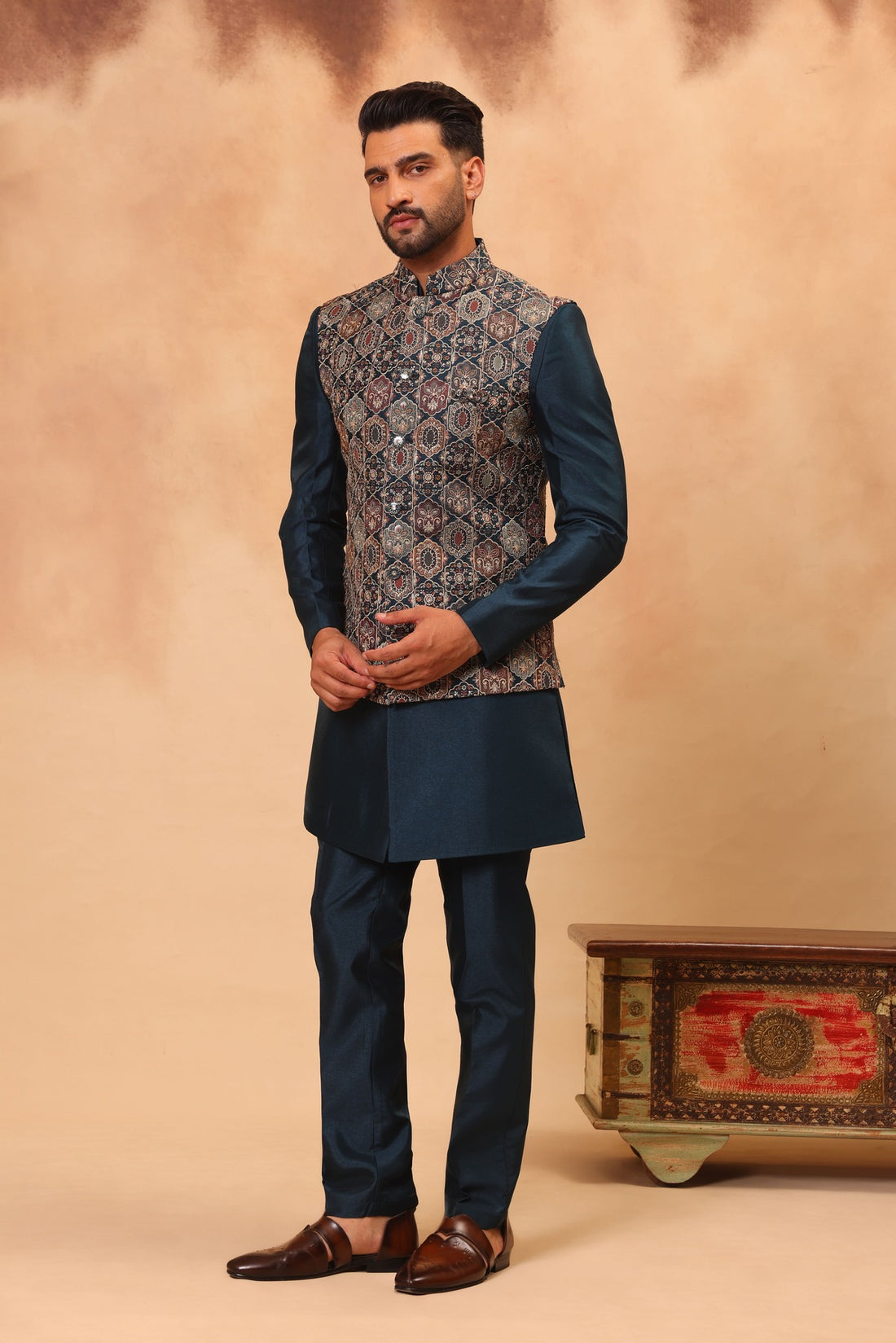 Components: 3 Colour: Navy Blue Fit: Regular Fit Neckline: Mandarin Collar Sleeve: Full Sleeves Jodhpuri...