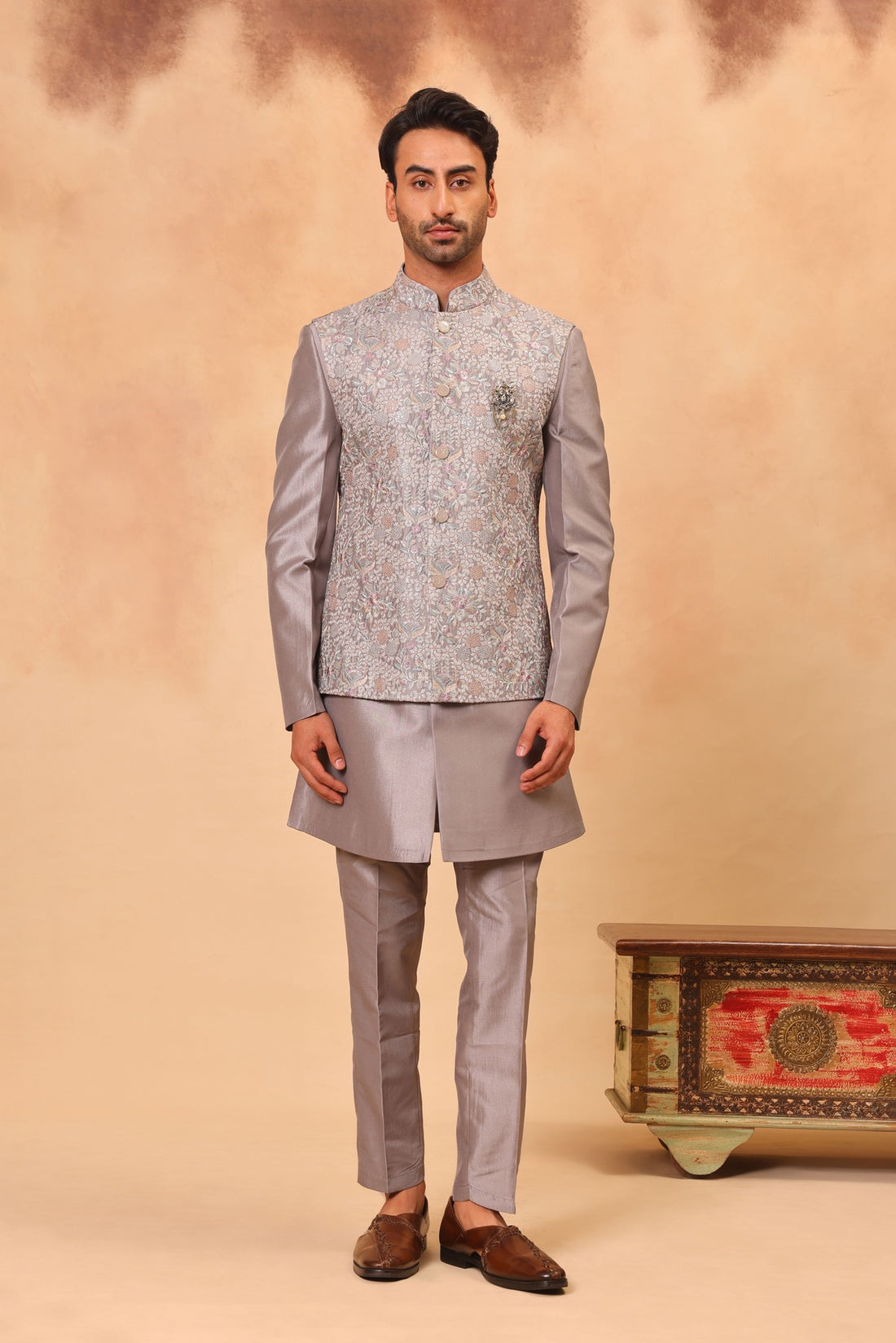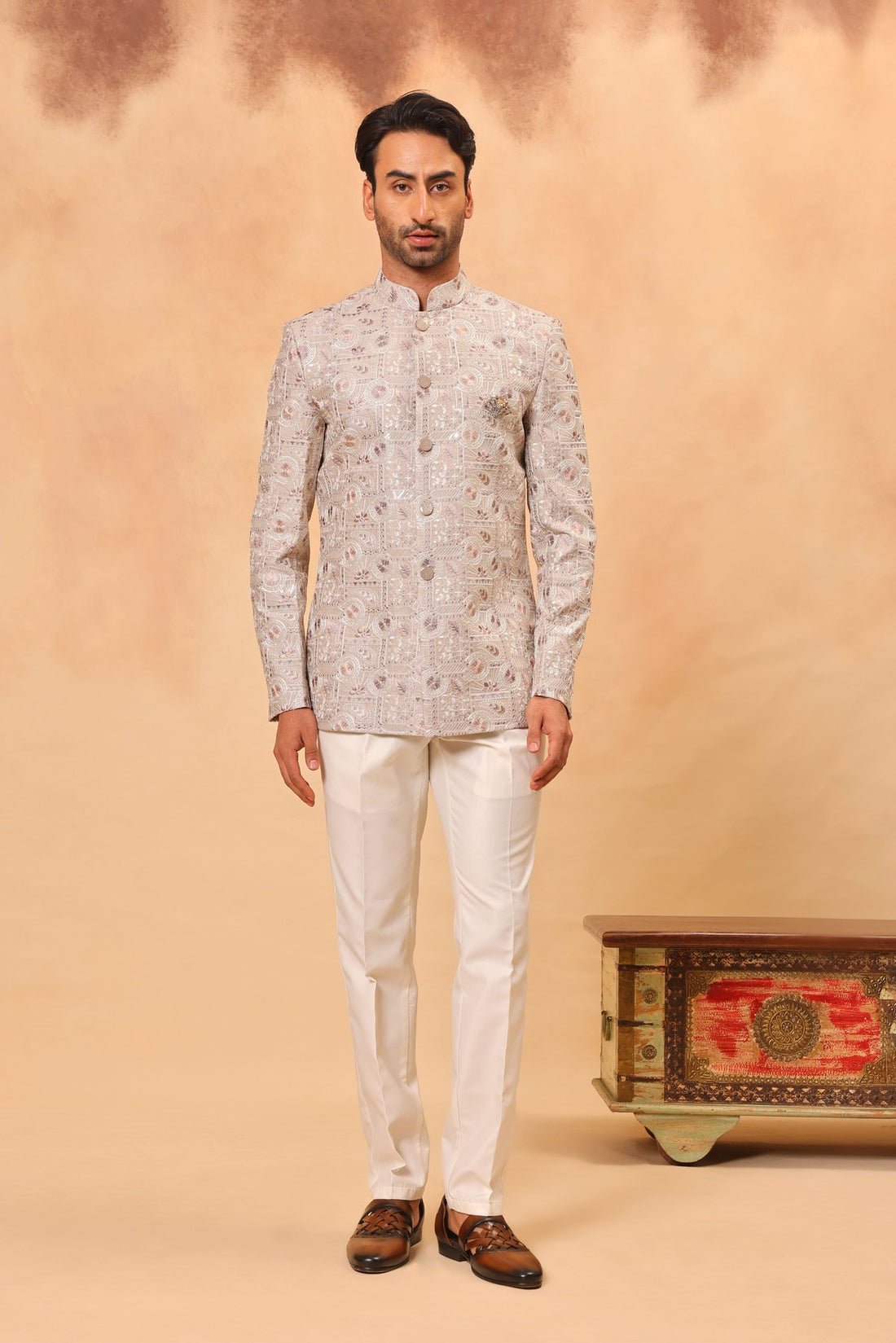 Natural Grey Embroidered Jodhpuri Set with Formal Pants