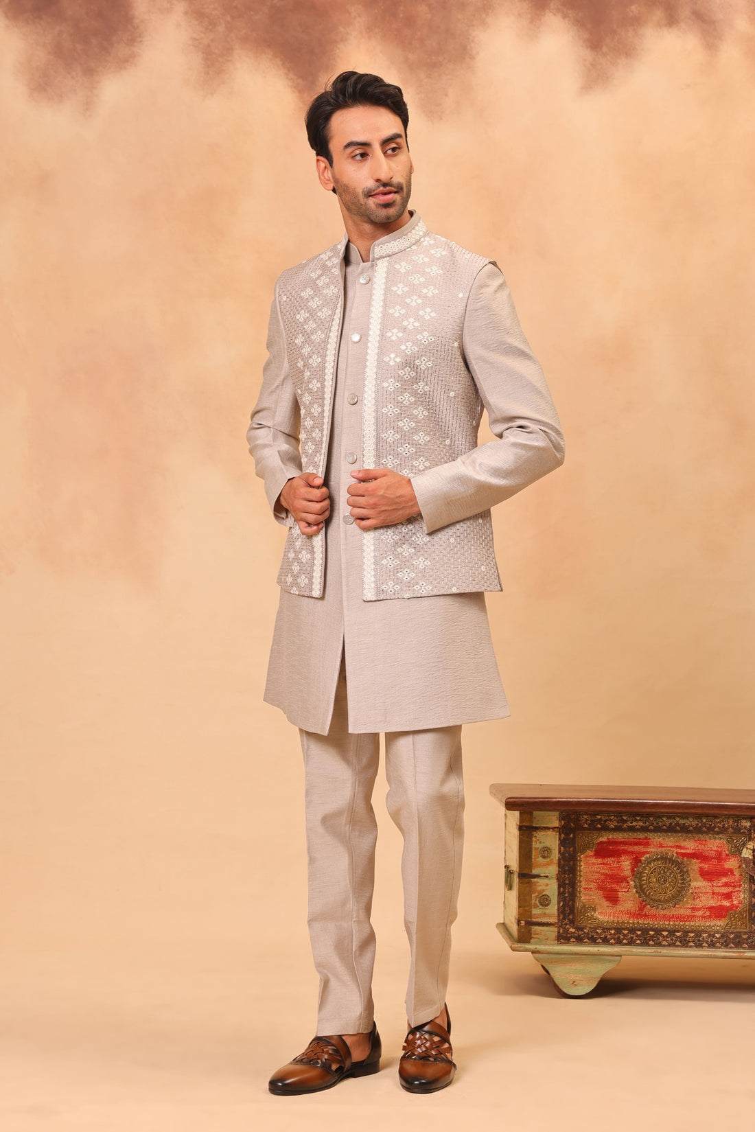 Components: 3 Colour: Natural Grey Fit: Regular Fit Neckline: Mandarin Collar Sleeve: Full Sleeves Jodhpuri...