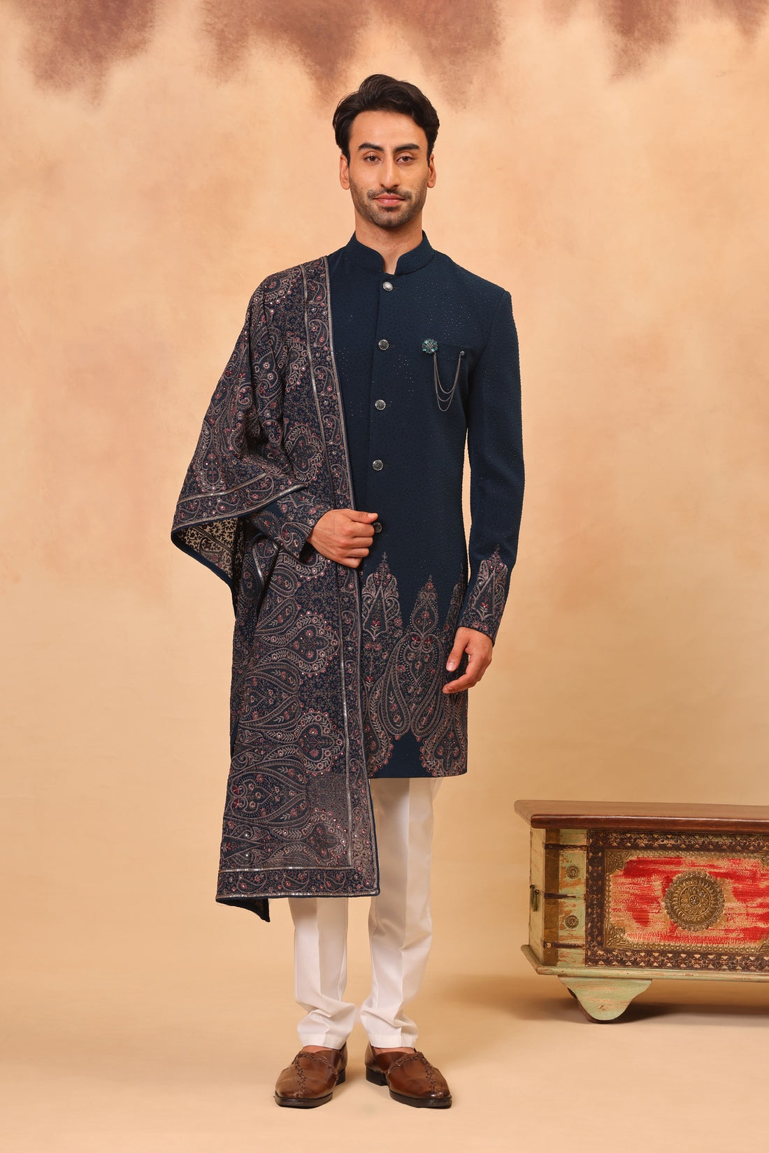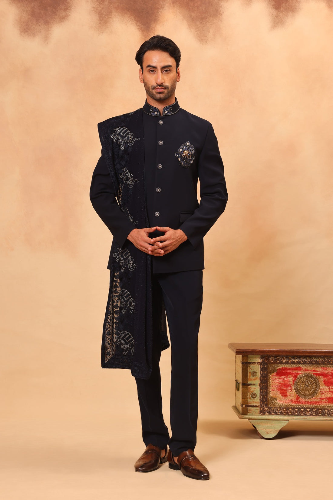 Navy Blue Embroidered Jodhpuri Set with Dupatta and Formal Pants