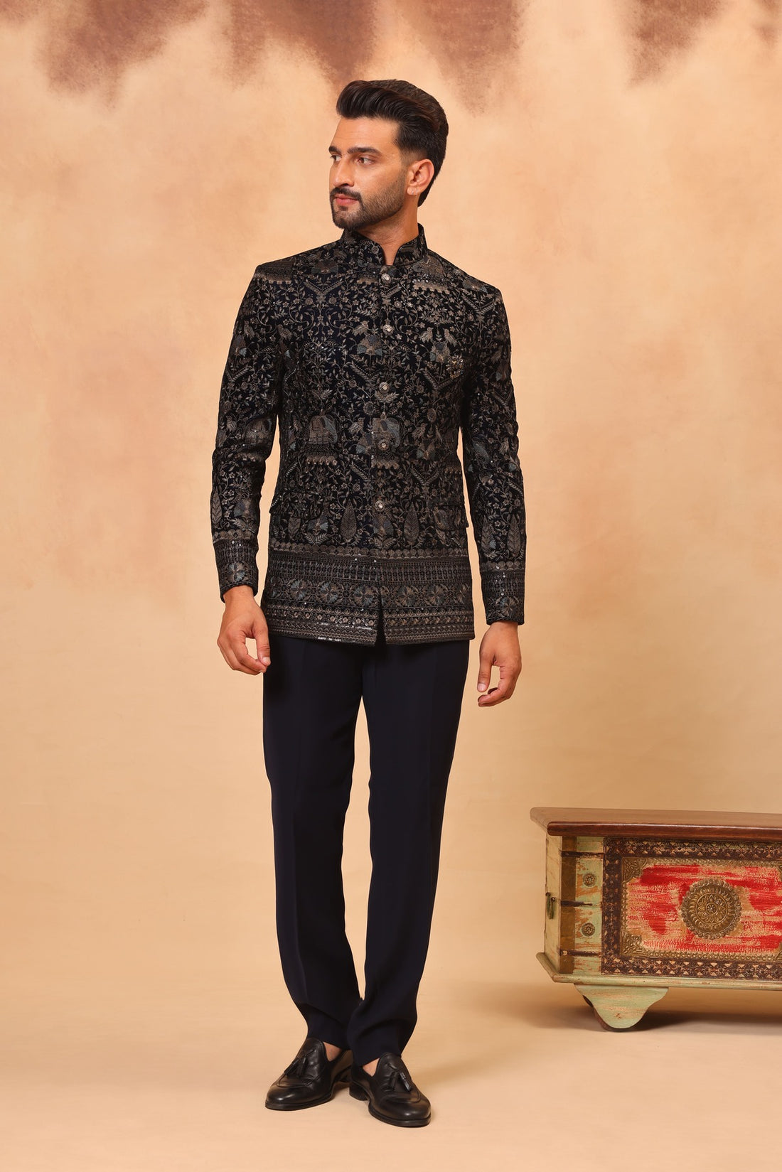 Navy Blue Velvet Embroidered Jodhpuri Set with Formal Pants