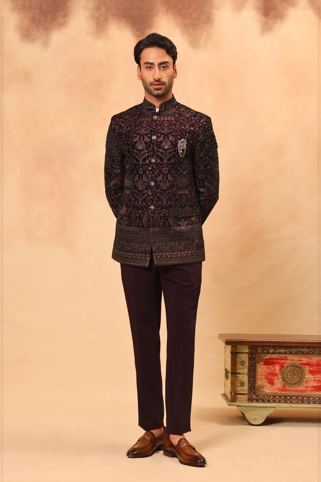 Wine Velvet Embroidered Jodhpuri Set with Formal Pants