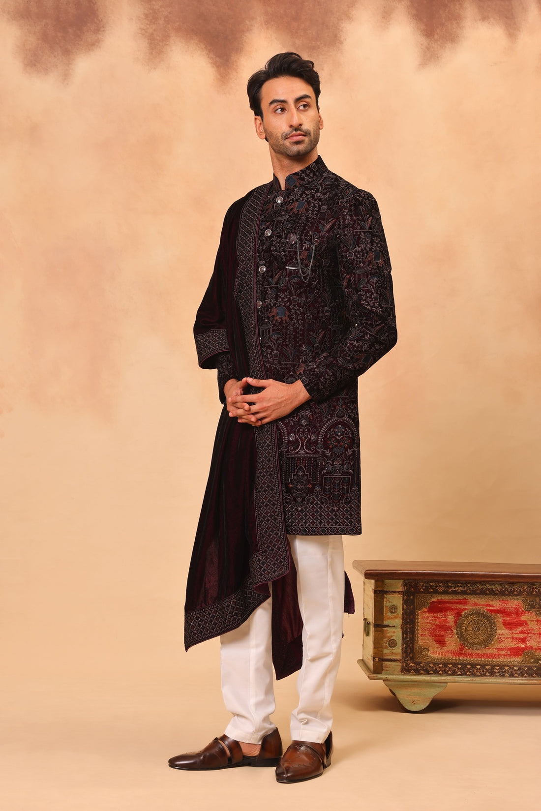 Wine Velvet Embroidered Sherwani Set with Dupatta