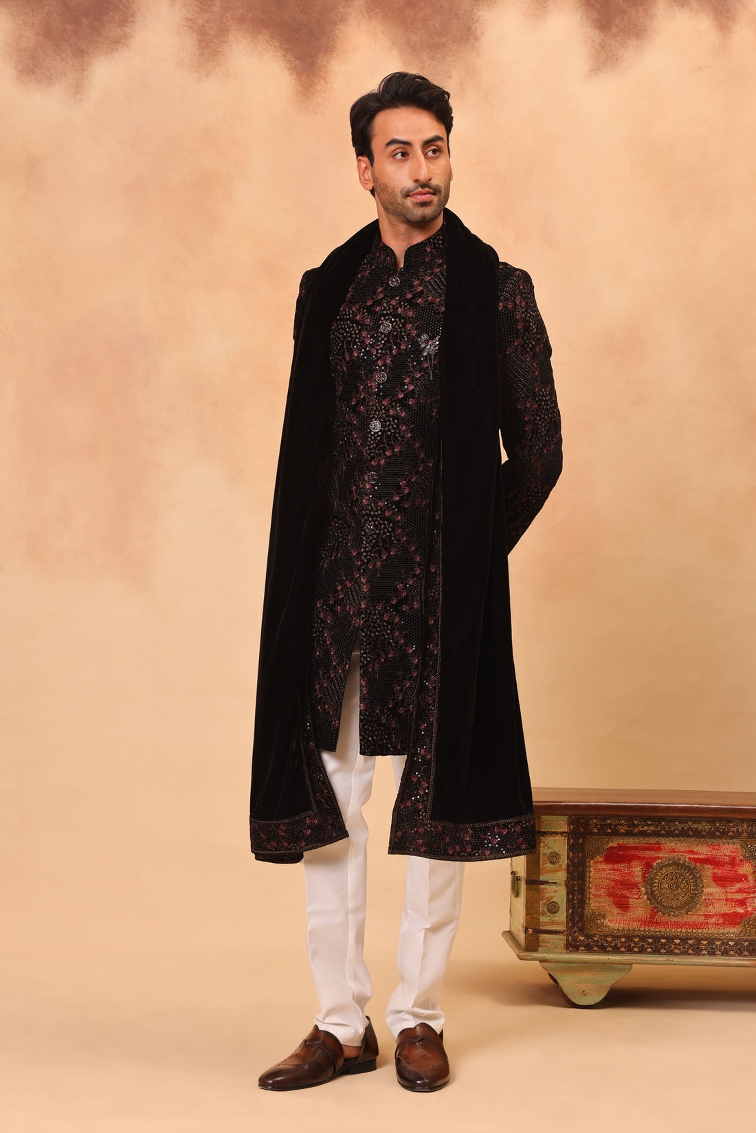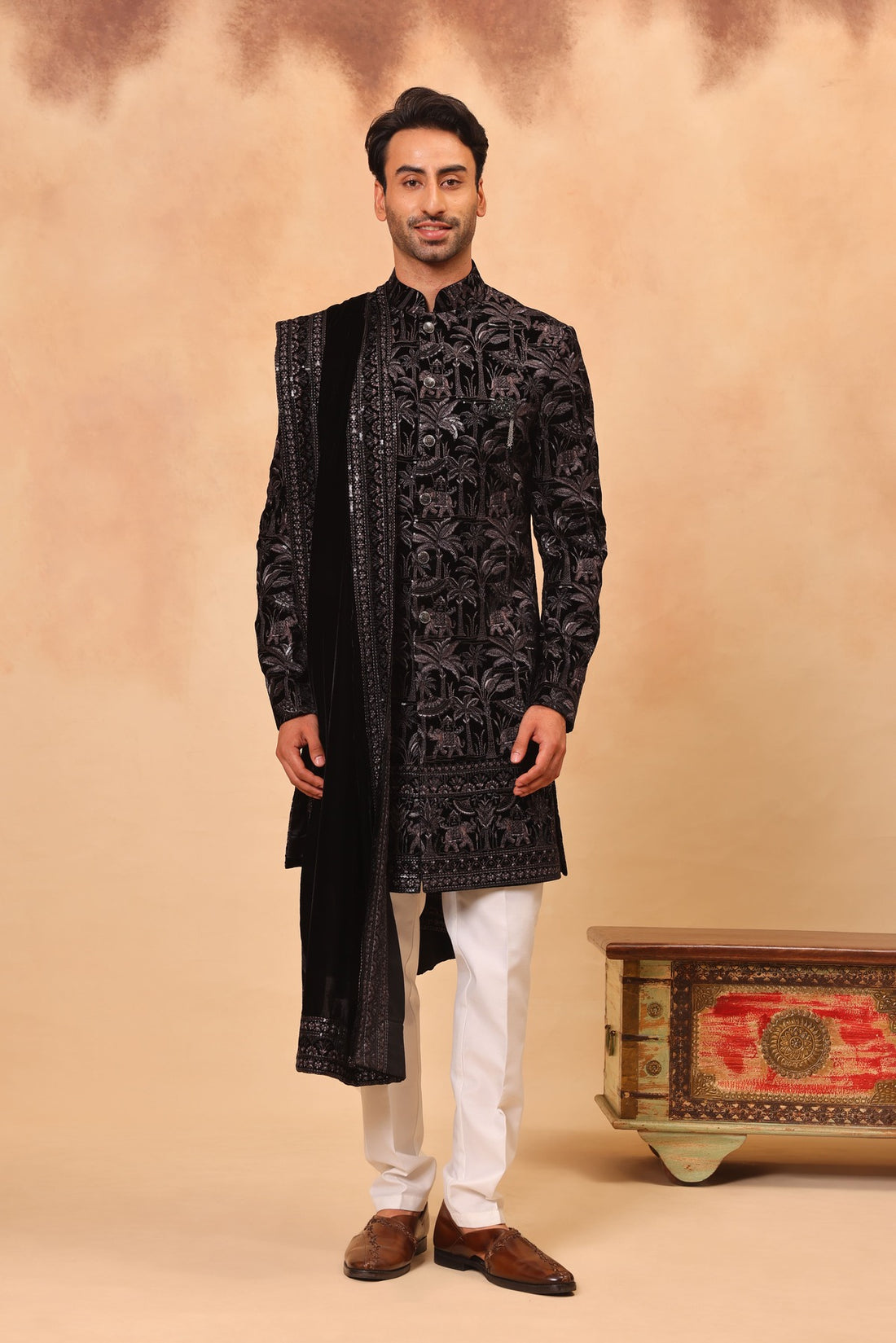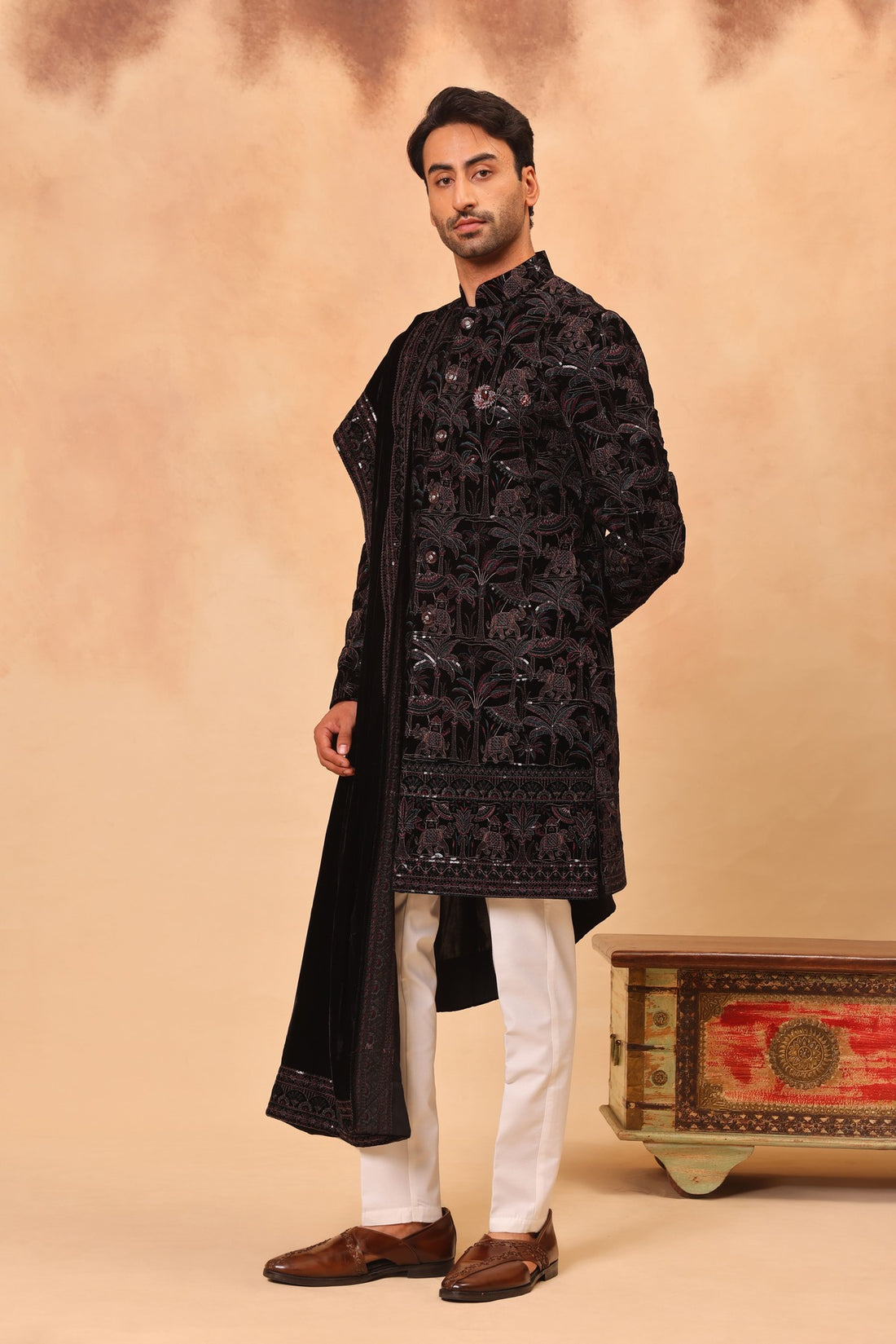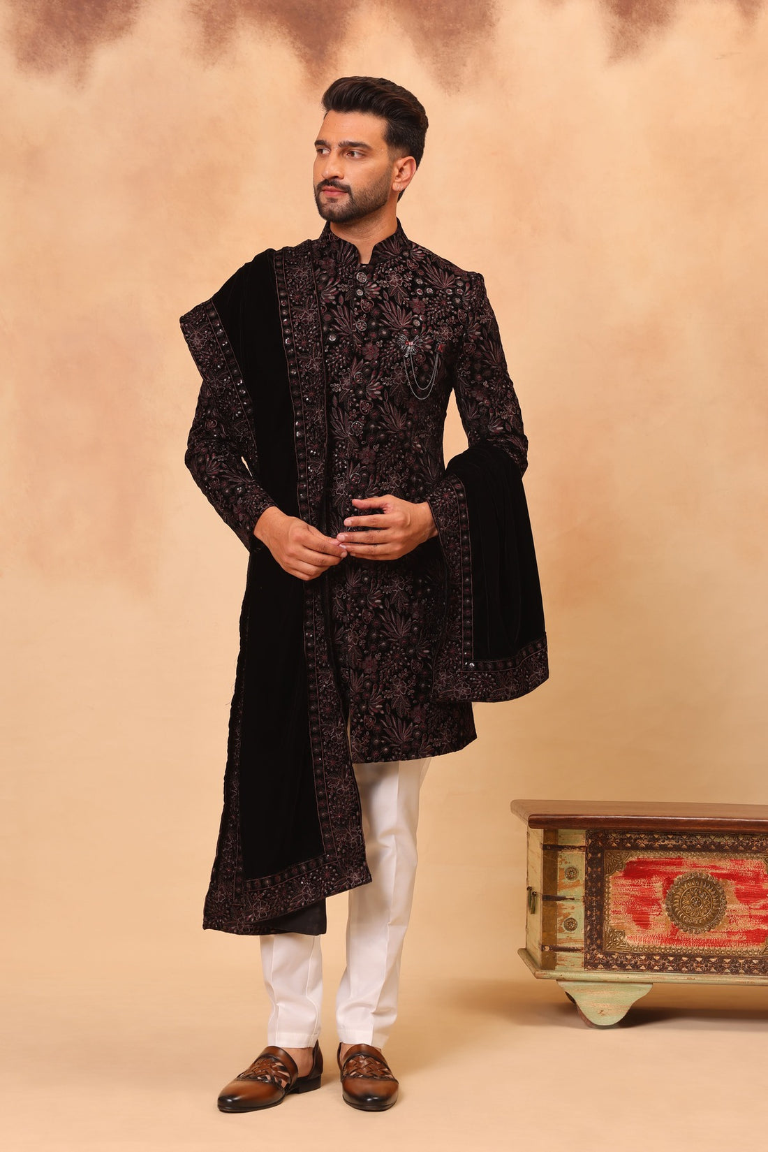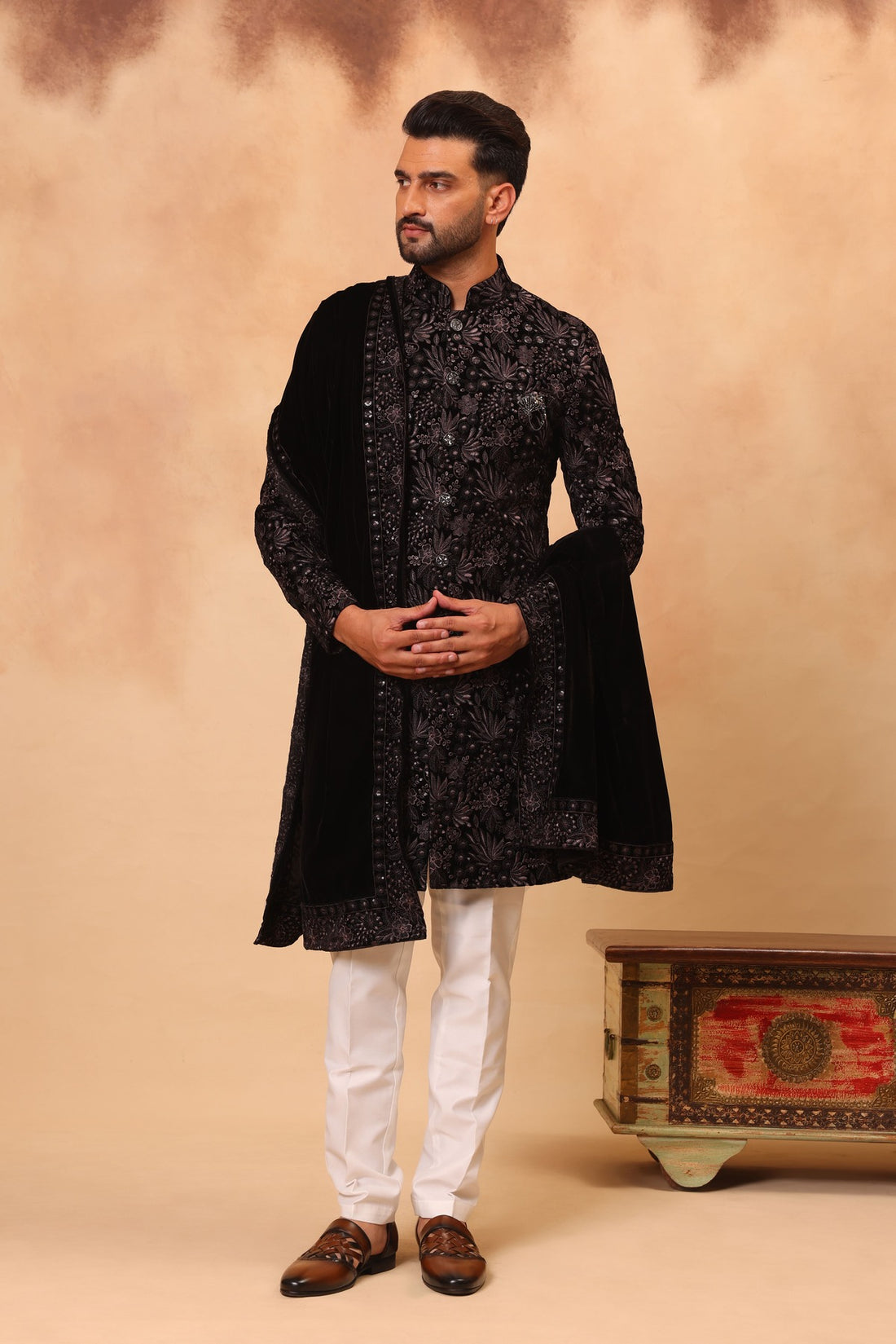 Black Velvet Embroidered Sherwani Set with Dupatta