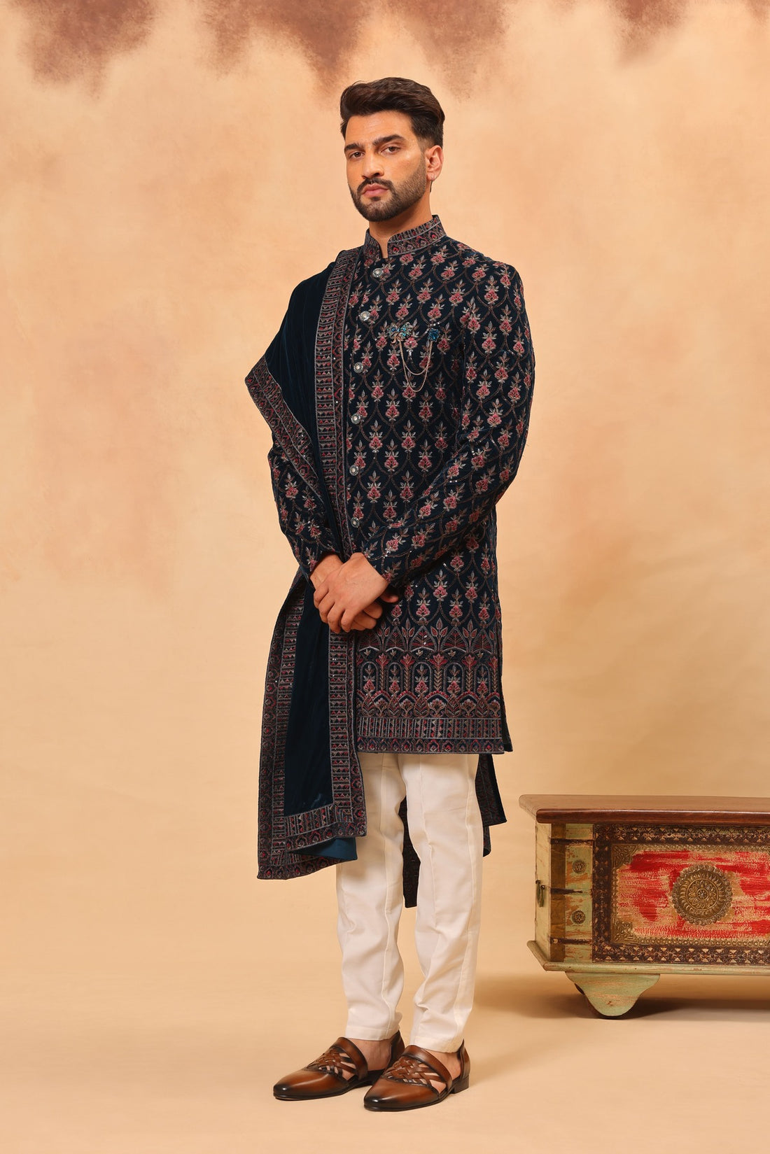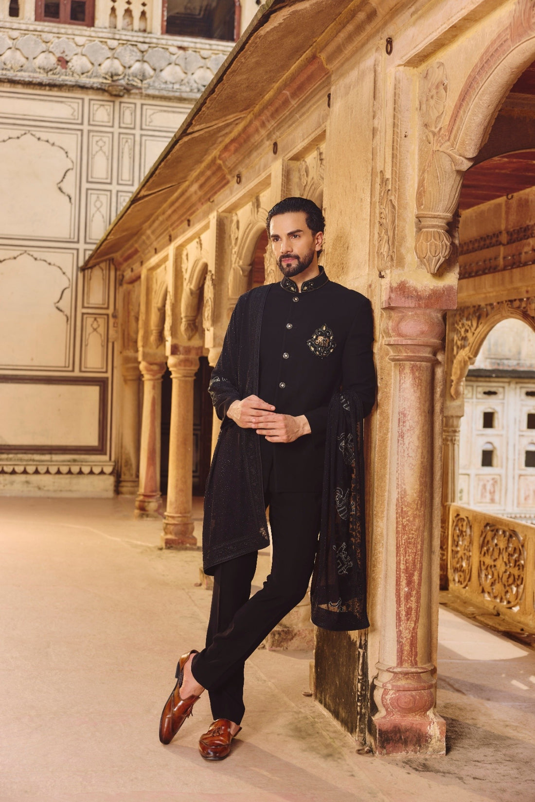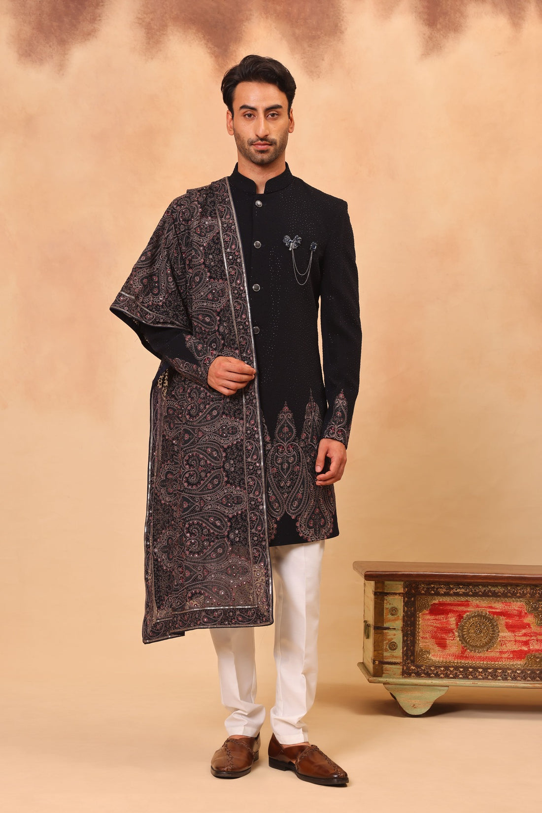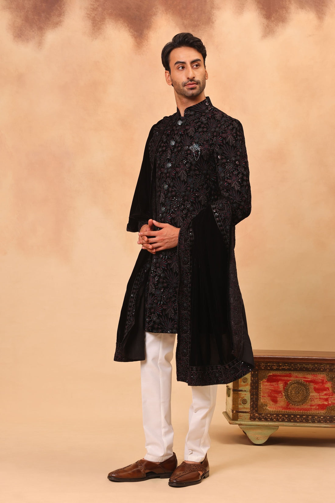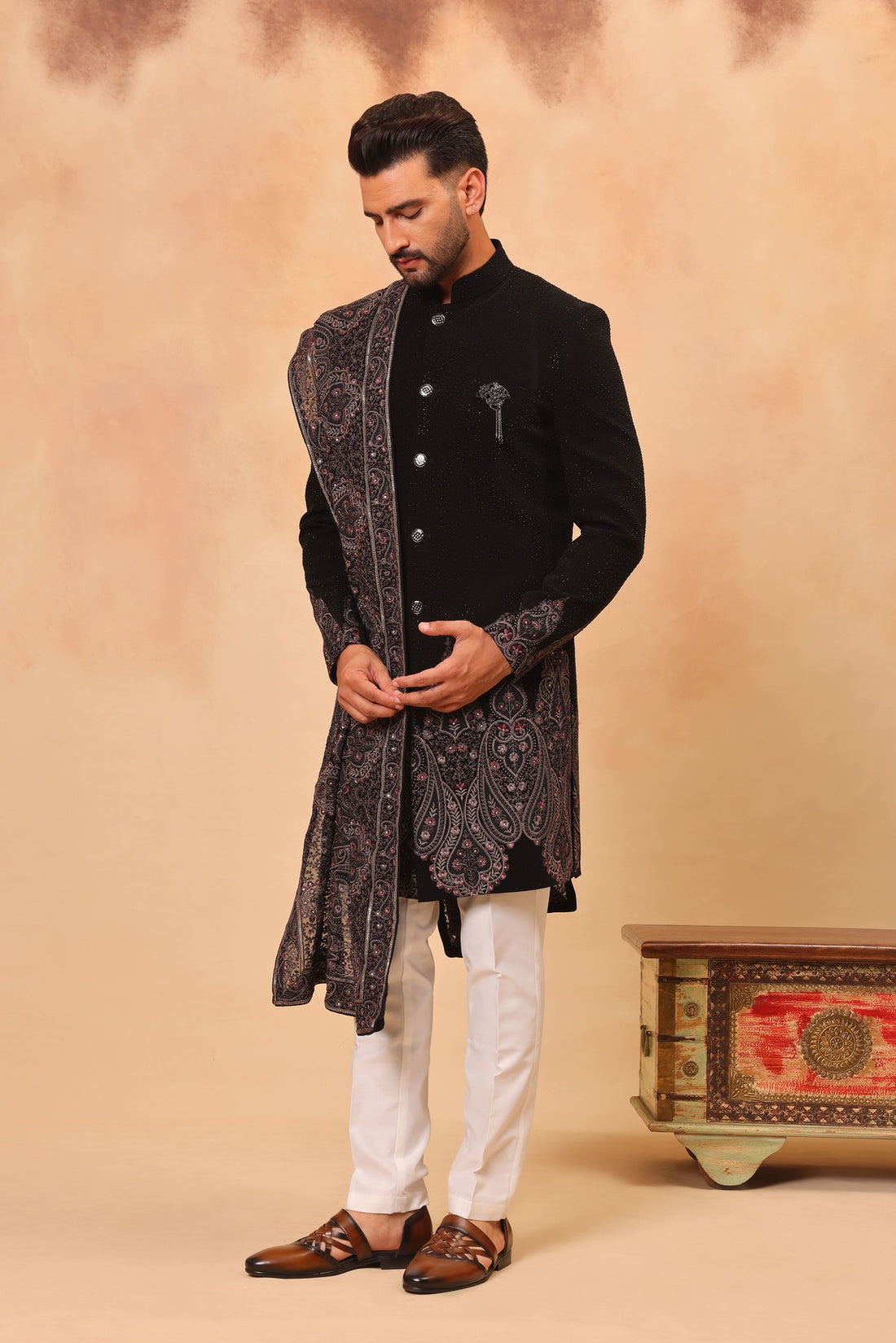 Black Velvet Embroidered Sherwani Set with Dupatta
