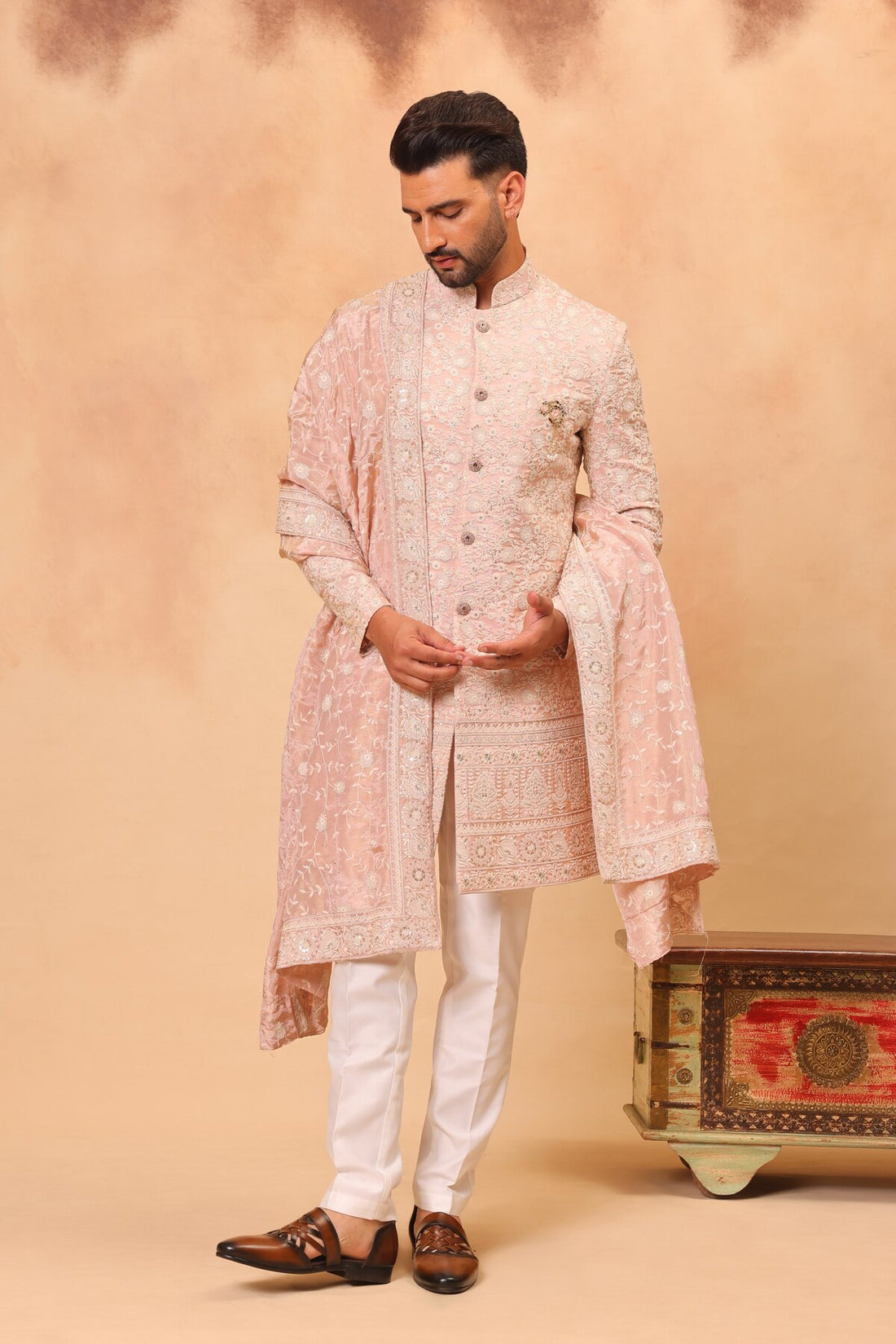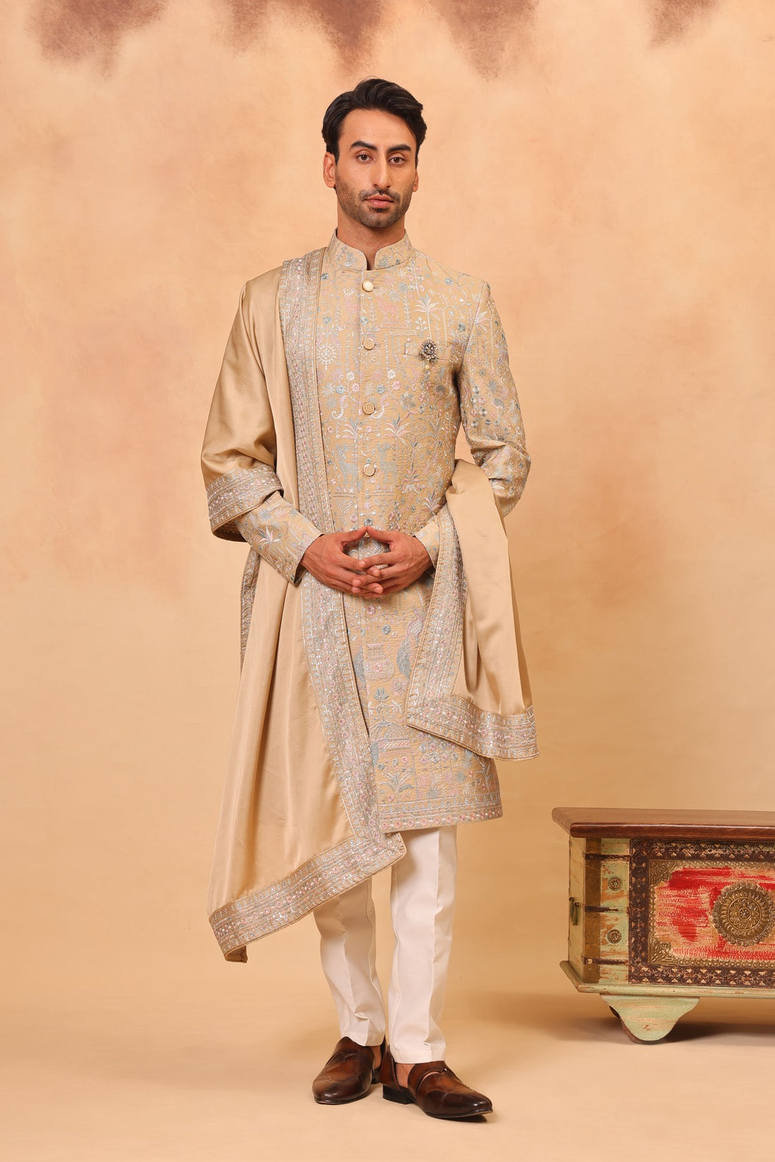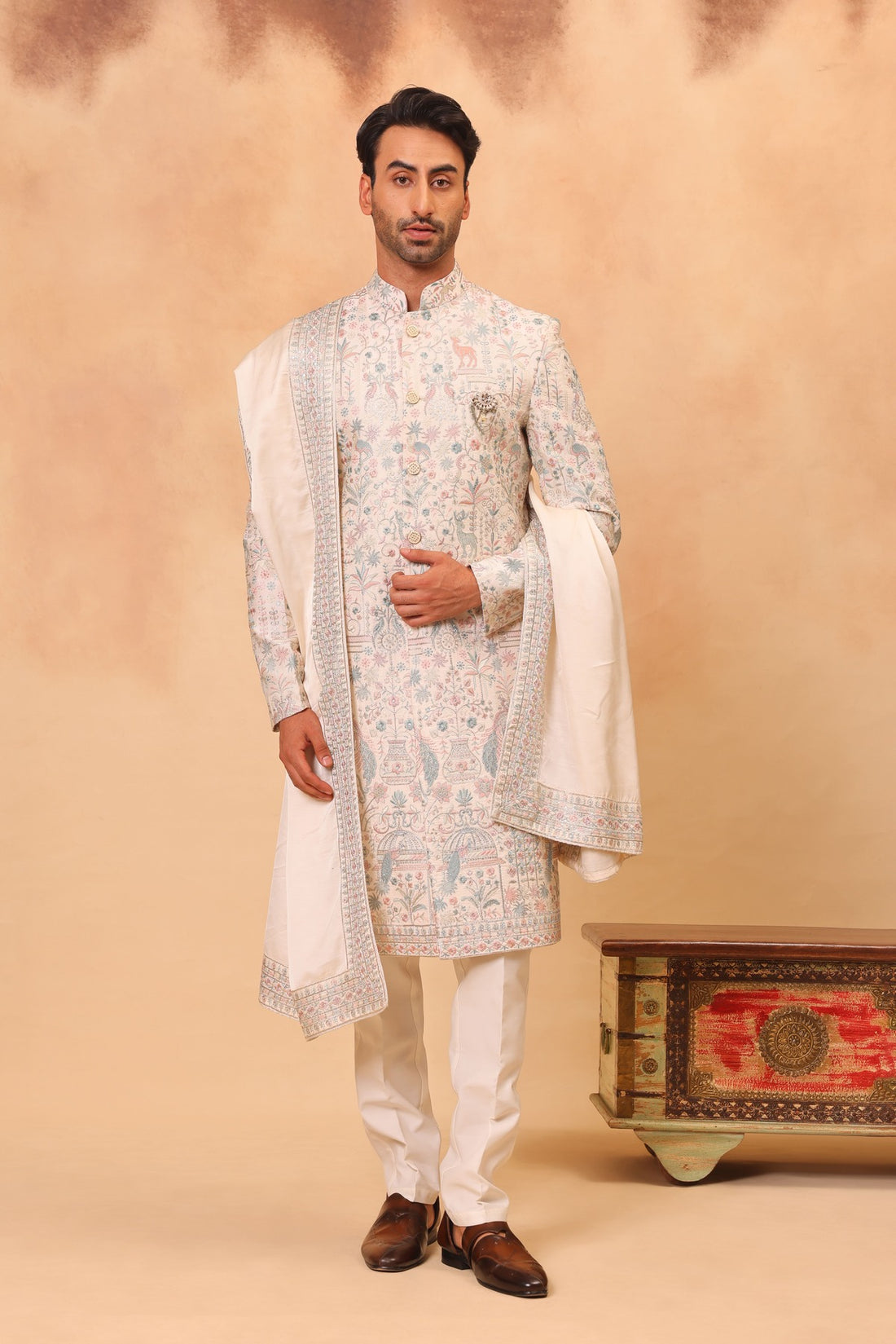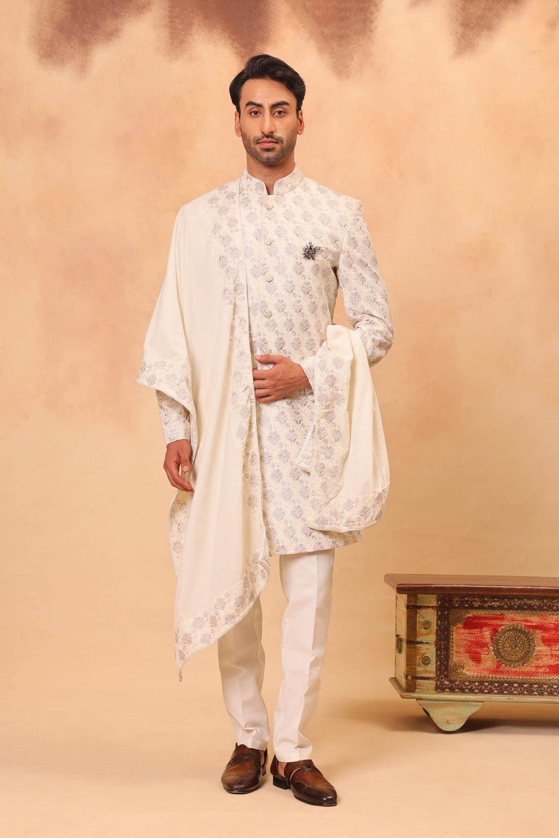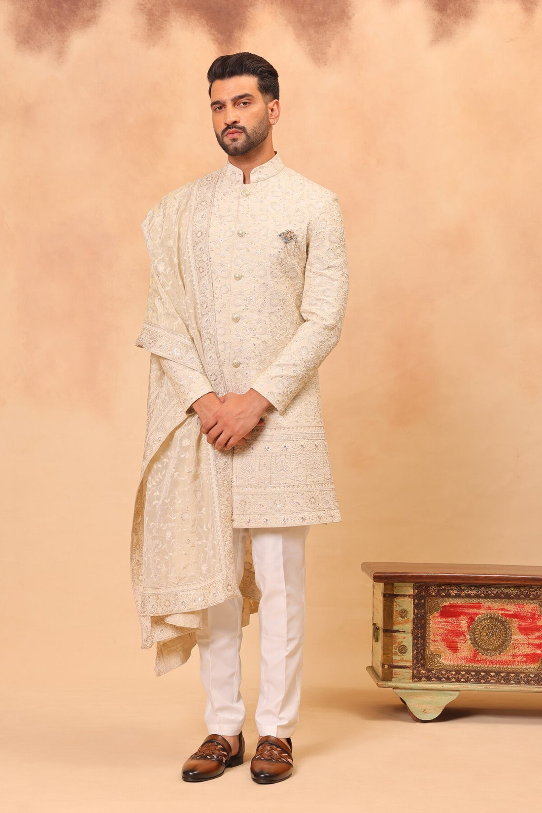 Cream Velvet Embroidered Sherwani Set with Dupatta