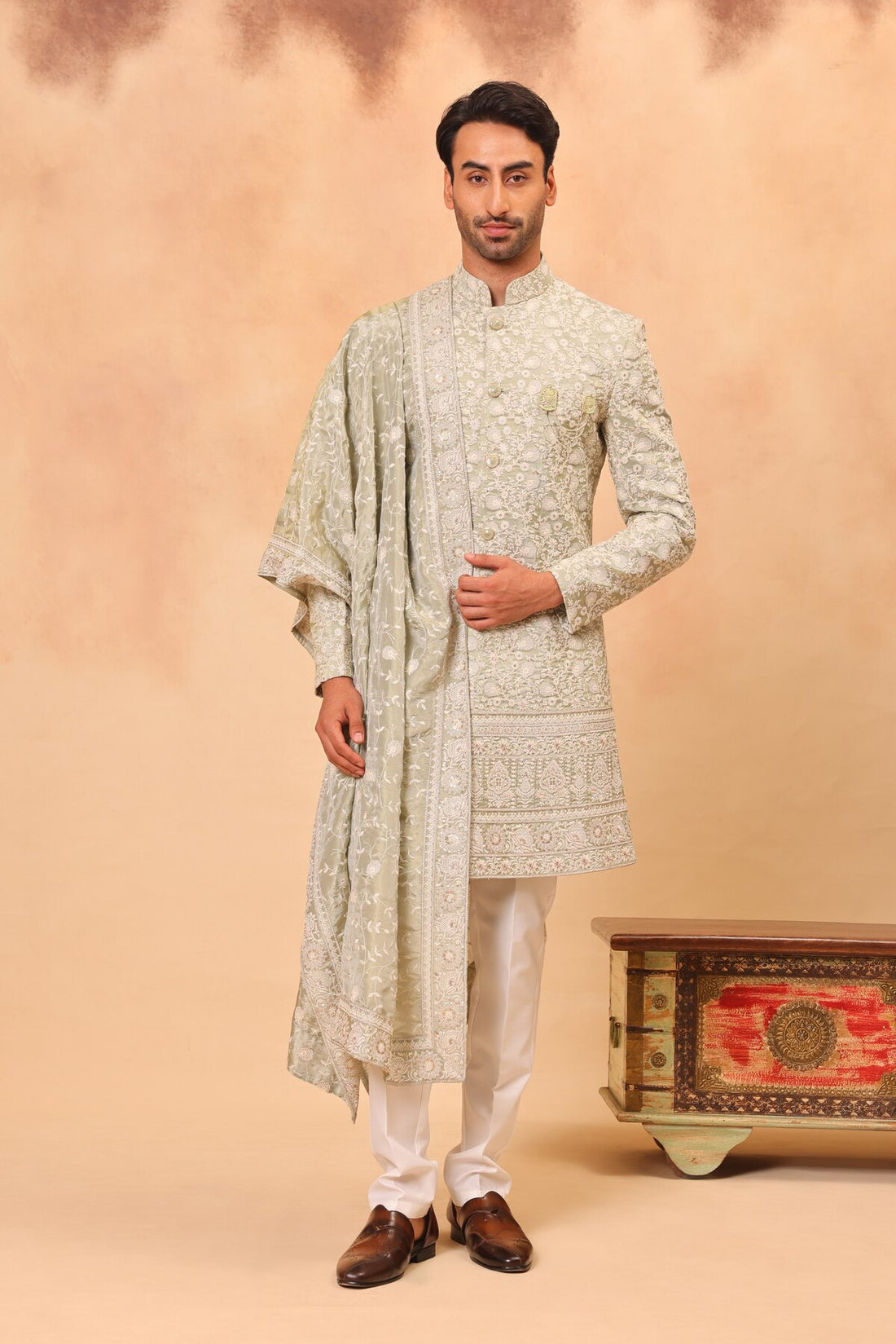 Rama Green Velvet Embroidered Sherwani Set with Dupatta