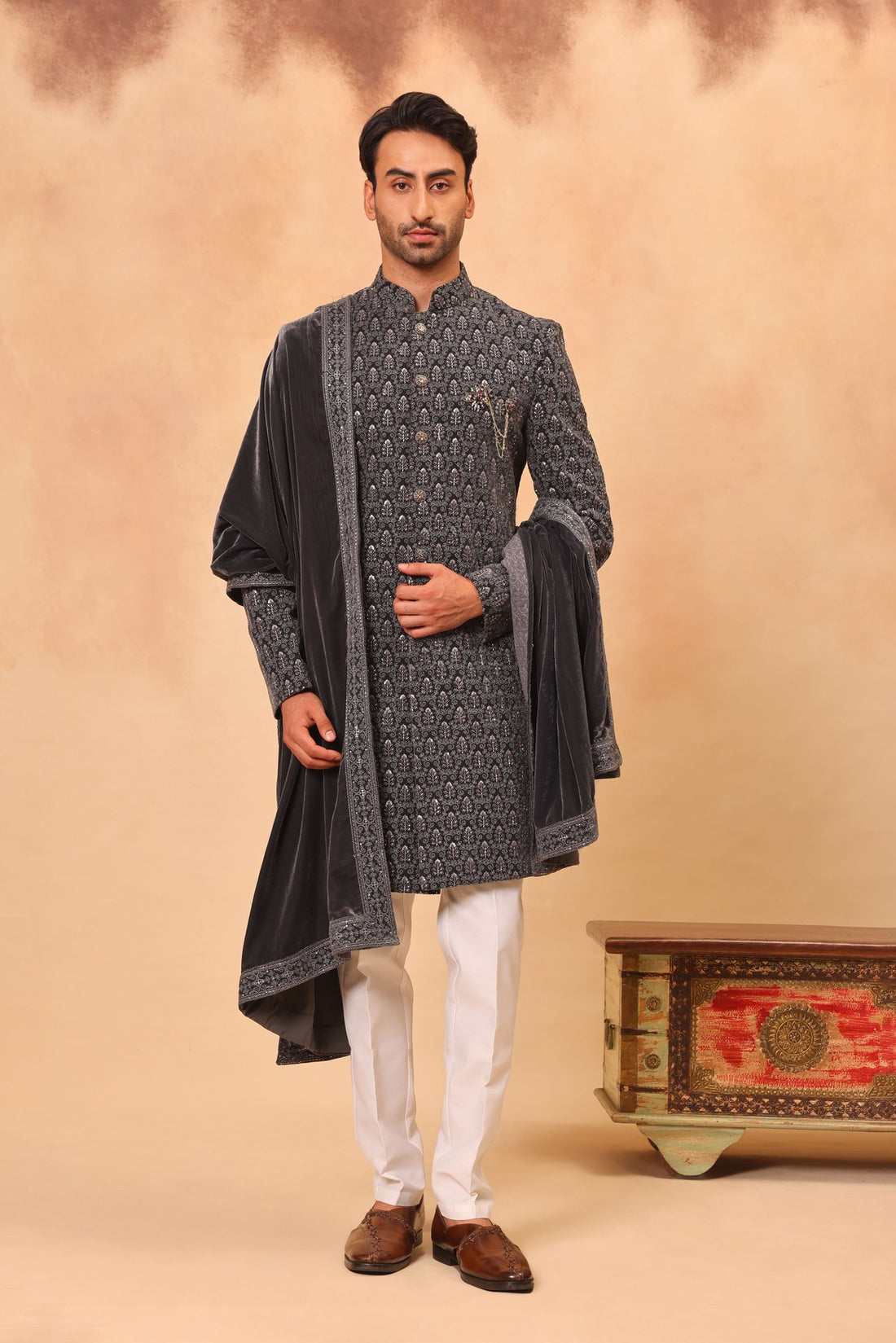 Grey Velvet Embroidered Sherwani Set with Dupatta