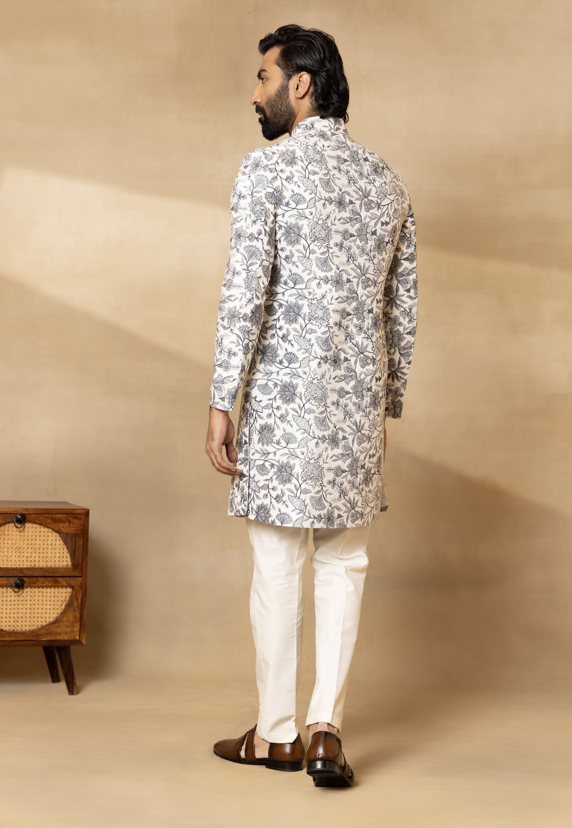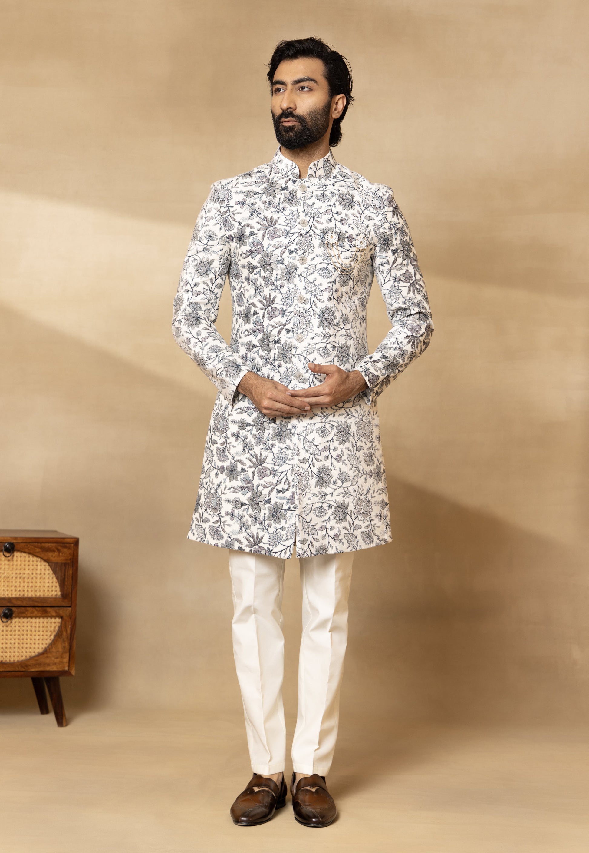 Components: 4 Colour: Cream Fit: Regular Fit Neckline: Mandarin Collar Sleeve: Full Sleeves Fabric: Velvet; Trouser- Cotton Silk; Dupatta- Velvet Elements: Embroidered Sherwani; Embroidered Velvet Dupatta; Embellished Buttons; Bespoke Brooch; Regular Fit Trouser. Care: Dry Clean Only. Steam Iron Only. Do Not Wash. (Possibility of slight colour variation)