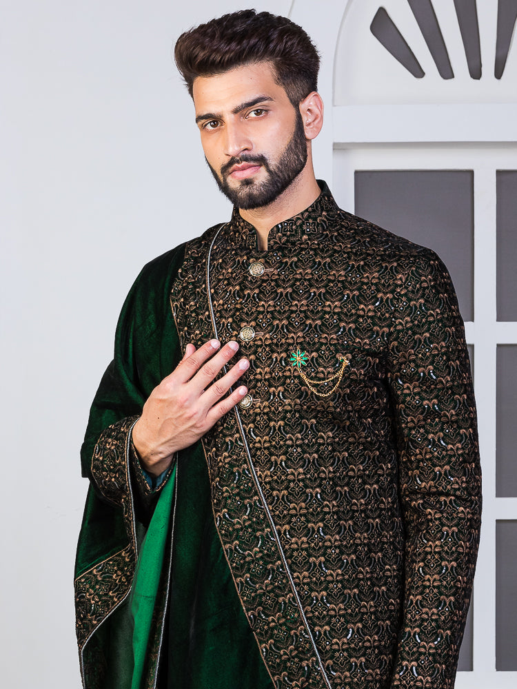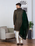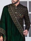 Green Velvet Embroidered Sherwani Set with Dupatta