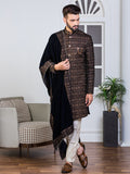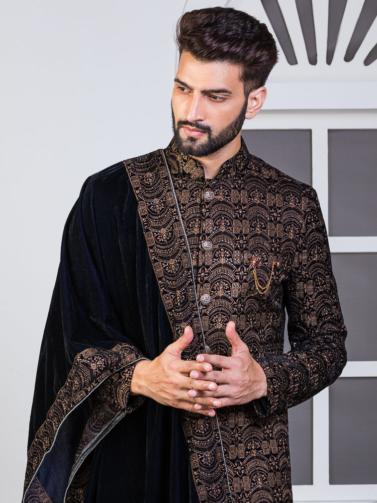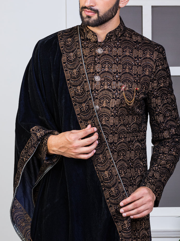 Navy Velvet Embroidered Sherwani Set with Dupatta