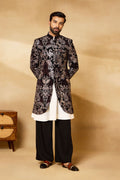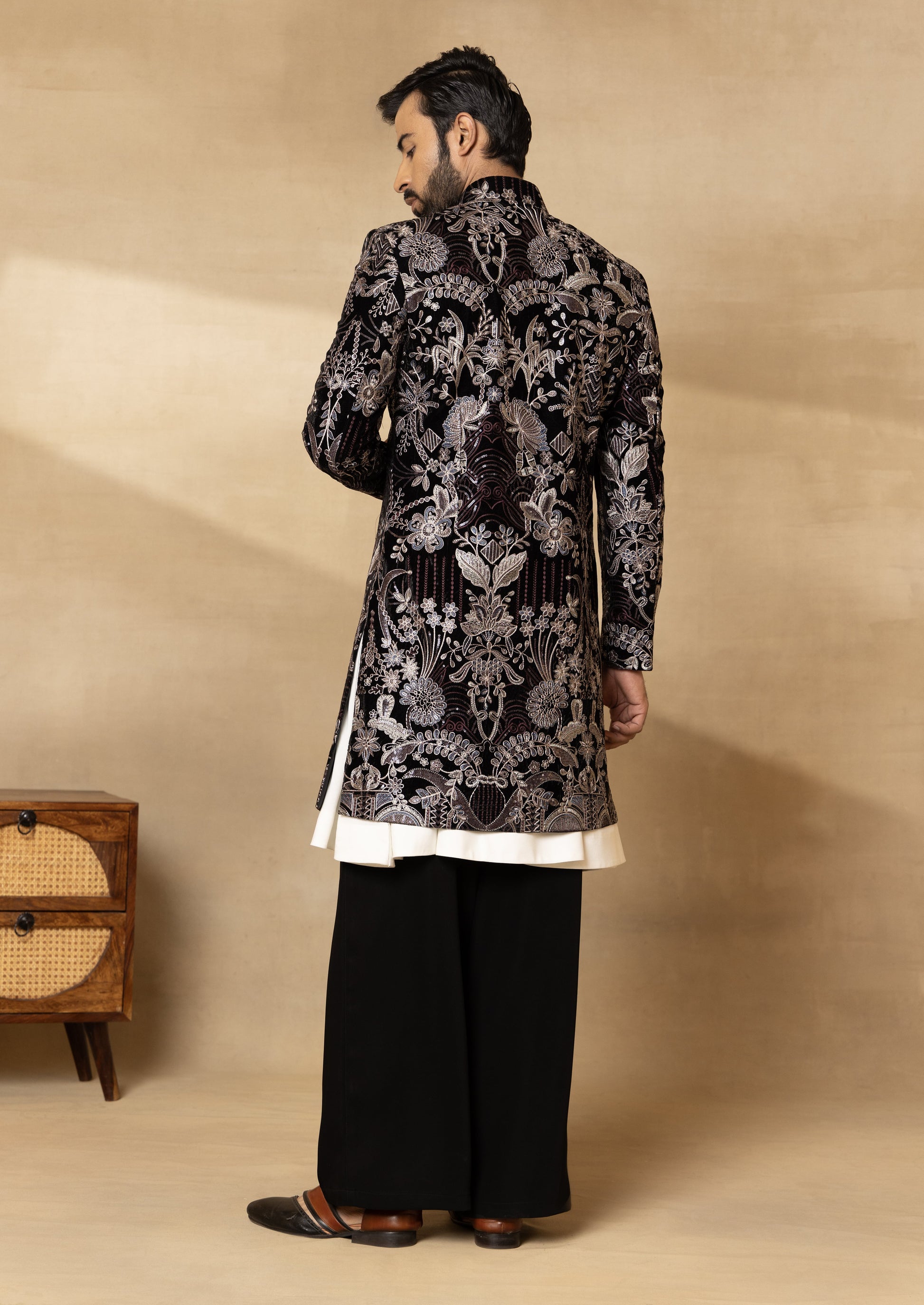 Black Velvet Embroidered Sherwani Set with Anarkali Kurta