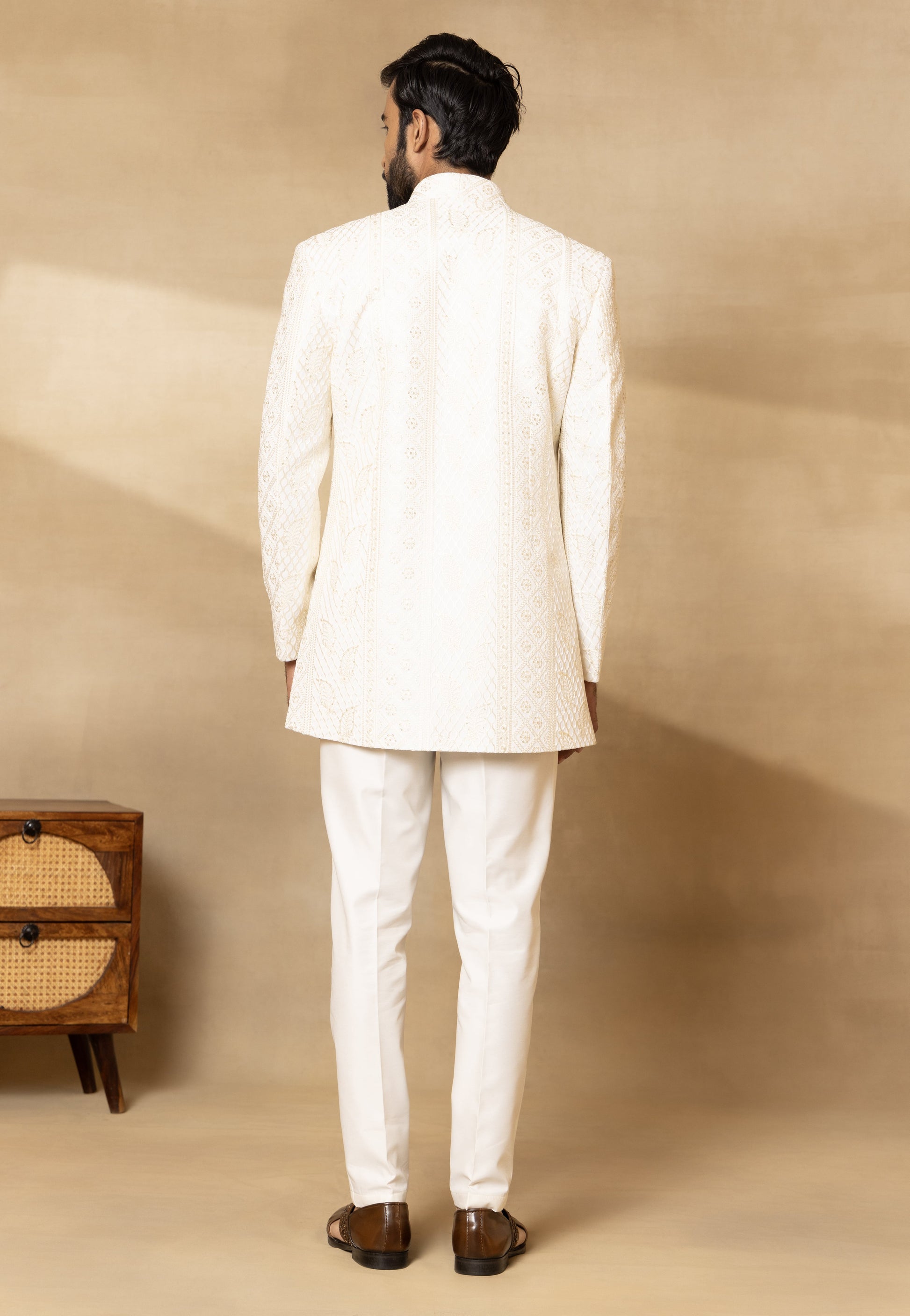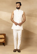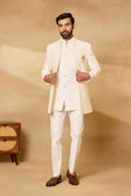 Components: 4 Colour: Cream Fit: Regular Fit Neckline: Mandarin Collar Sleeve: Half Sleeves Jacket Inside; Full Sleeves Short Jacket Fabric: Faux Georgette Half Sleeve Nehru Jacket; Katan Silk Short Jacket; Trouser- Katan Silk Elements: Embroidered Short Jacket with Embroidered Half Jacket inside; Embellished Buttons; Bespoke Brooch; Regular Fit Trouser. Care: Dry Clean Only. Steam Iron Only. Do Not Wash. (Possibility of slight colour variation)