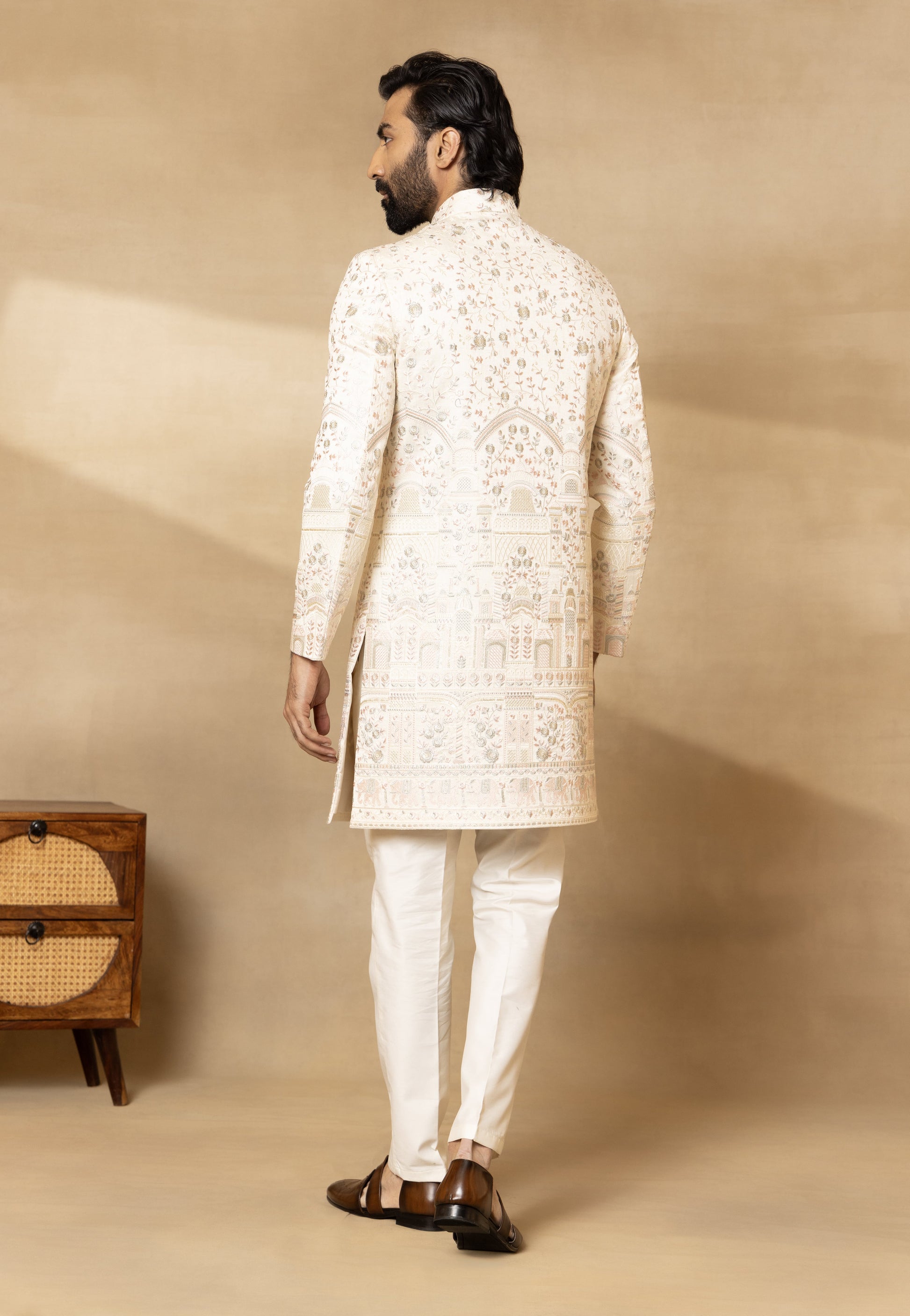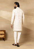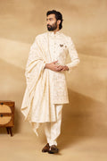 Cream Silk Multi Thread Embroidered Sherwani Set with Dupatta