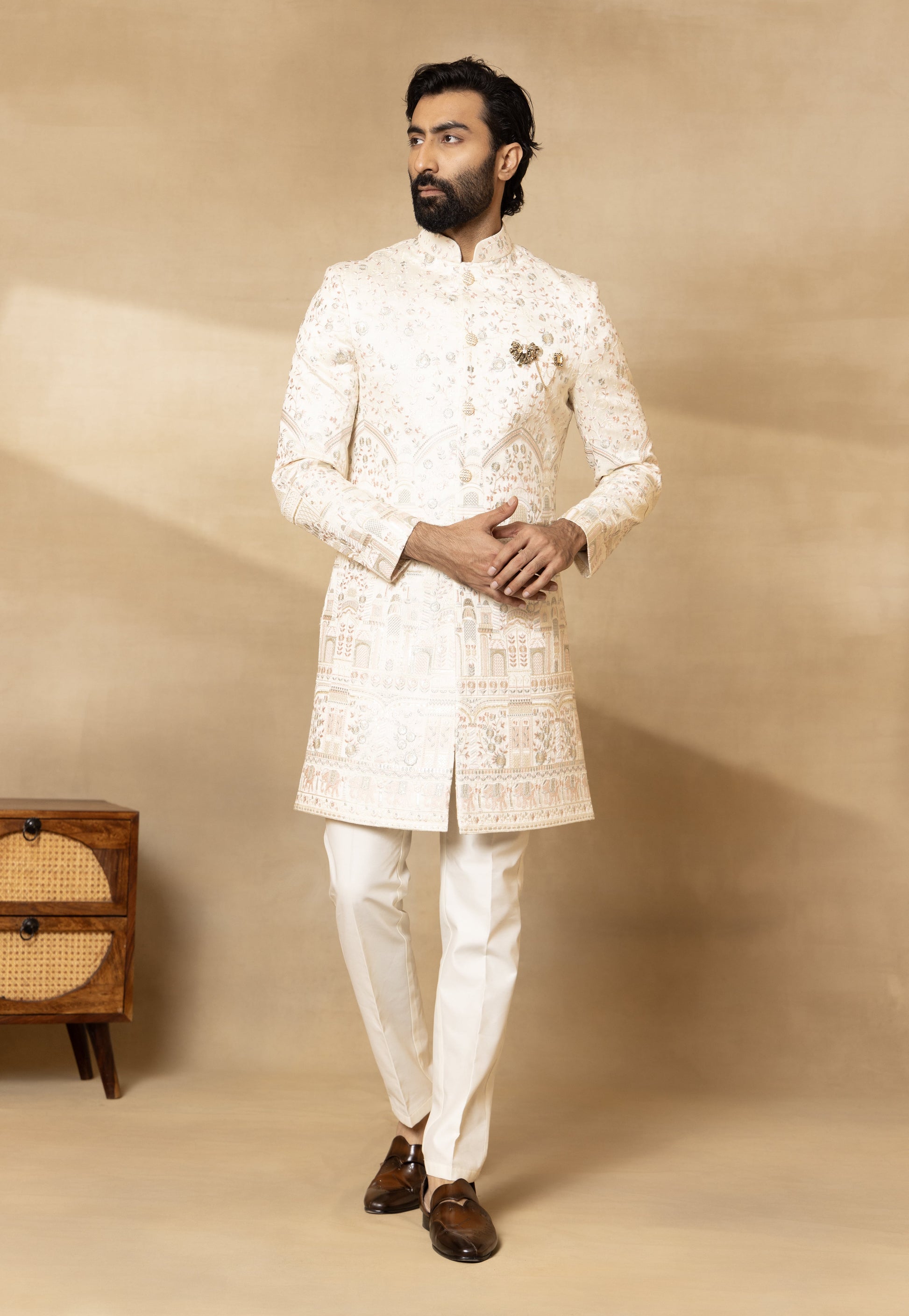 Components: 4 Colour: Cream Fit: Regular Fit Neckline: Mandarin Collar Sleeve: Full Sleeves Fabric: Creamy Silk; Trouser- Cotton Silk; Dupatta- Creamy Silk Elements: Multi Thread Embroidered Sherwani; Embroidered Creamy Silk Dupatta; Embellished Buttons; Bespoke Brooch; Regular Fit Trouser. Care: Dry Clean Only. Steam Iron Only. Do Not Wash. (Possibility of slight colour variation)