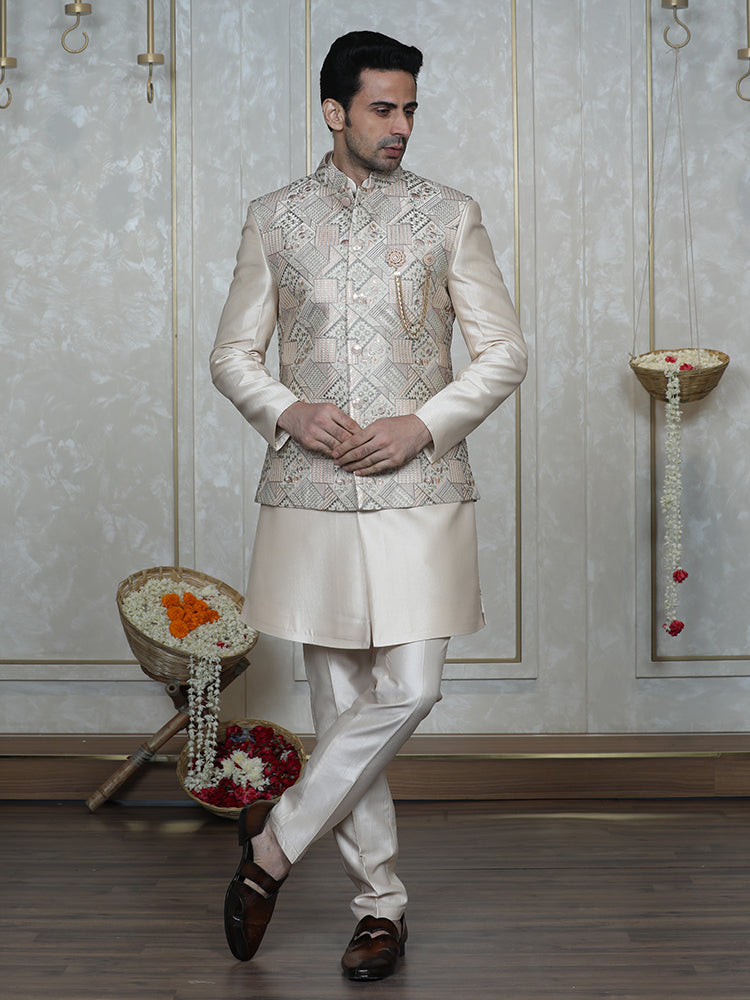 - Elements: Embroidered Nehru Jacket; Plain Indo Western; Embellished Buttons; Bespoke Brooch; Regular Fit Trouser.