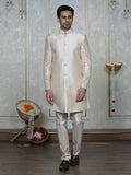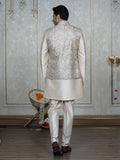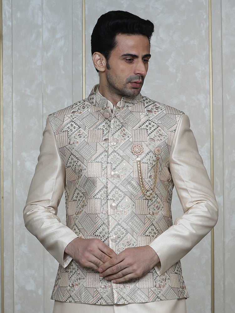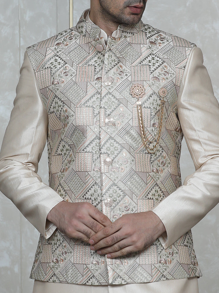 Fawn Embroidered Nehru Jacket Set with Foil Work