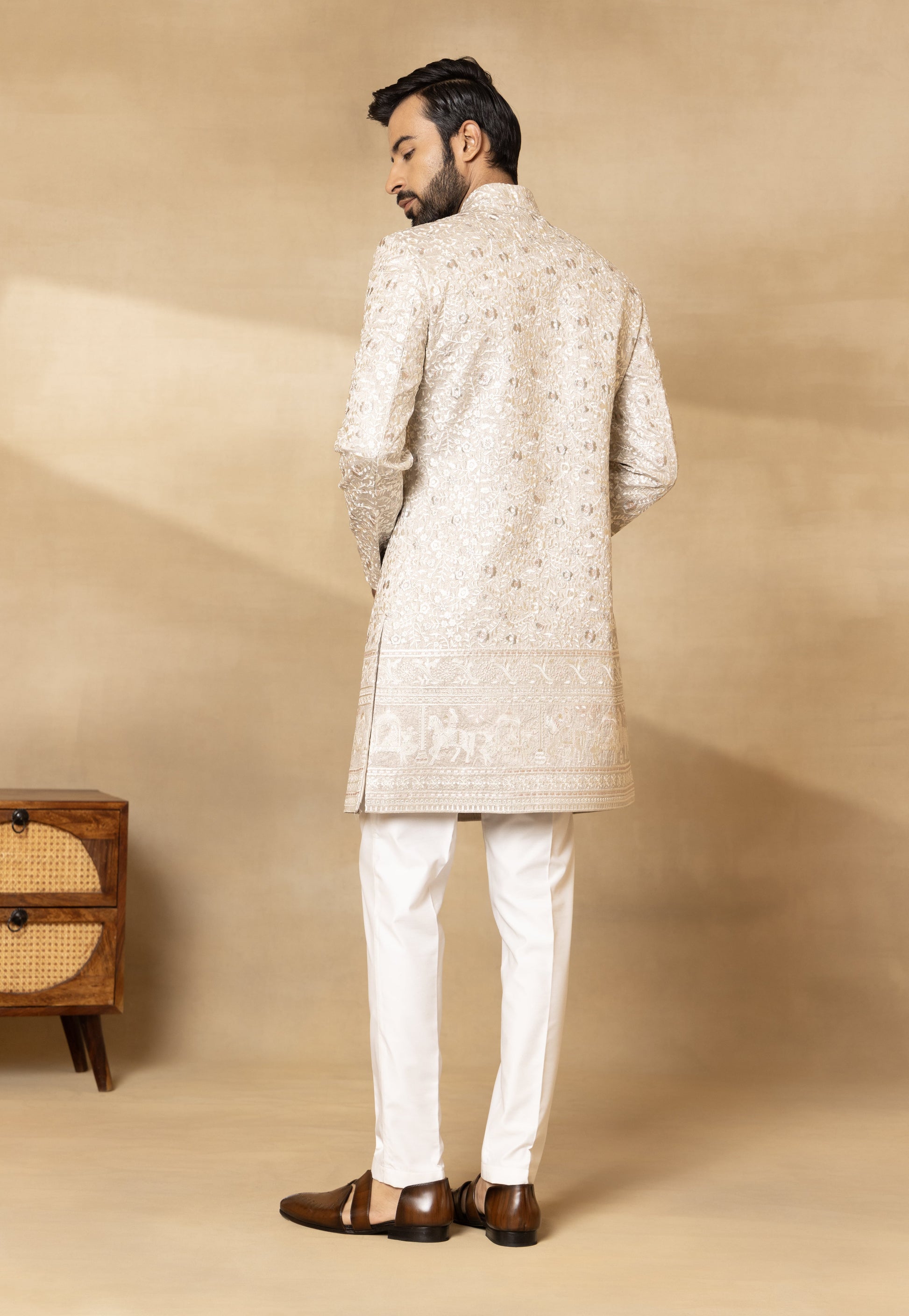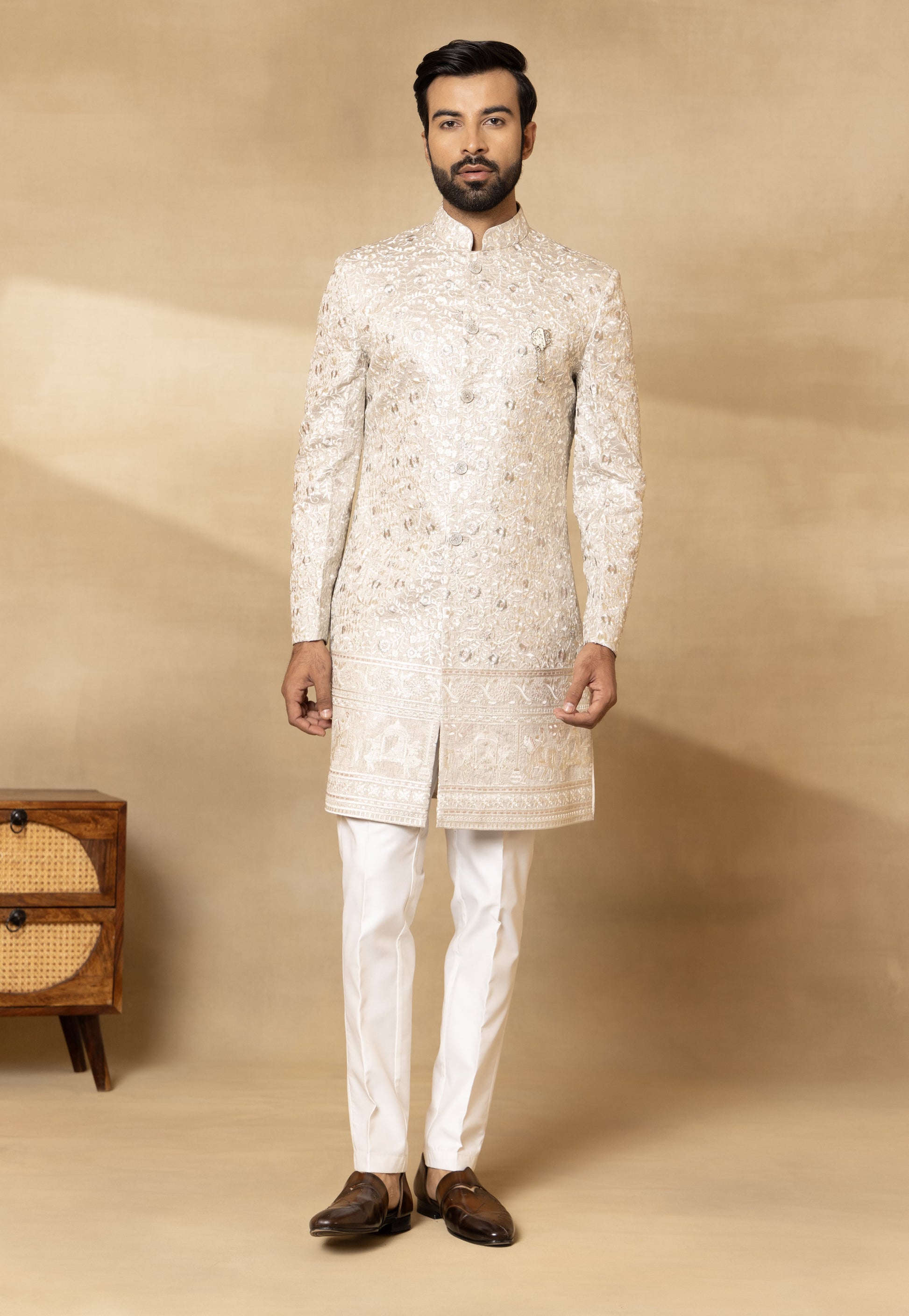 Components: 4 Colour: Grey Fit: Regular Fit Neckline: Mandarin Collar Sleeve: Full Sleeves Fabric: Camery Silk; Trouser- Cotton Silk; Dupatta- Camery Silk Elements: Embroidered Sherwani; Embroidered Camery Silk Dupatta; Embellished Buttons; Bespoke Brooch; Regular Fit Trouser. Care: Dry Clean Only. Steam Iron Only. Do Not Wash. (Possibility of slight colour variation)