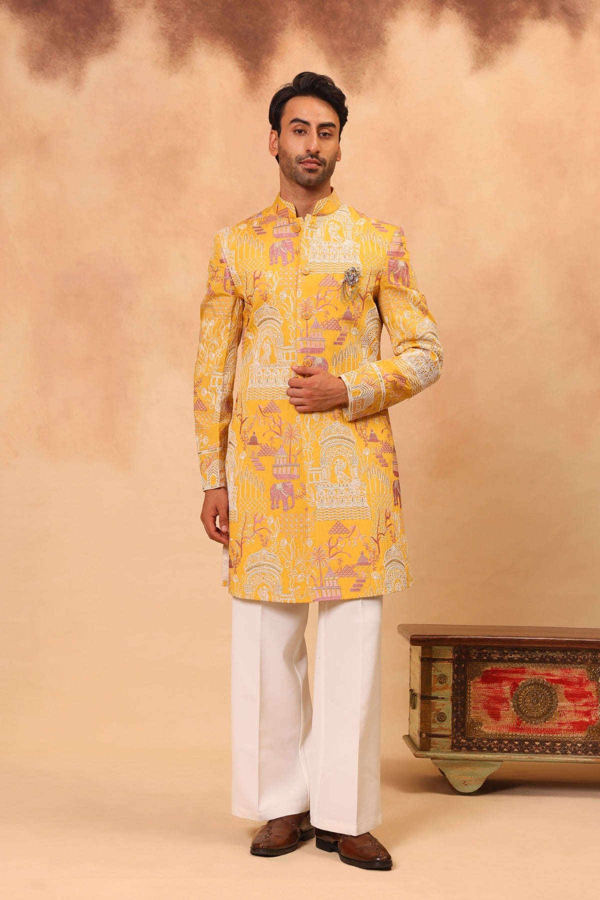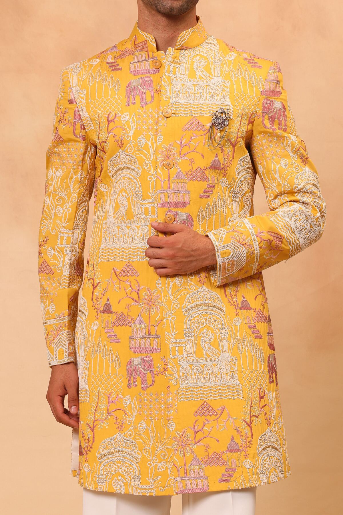 Elements: Heavy Thread Embroidered Sherwani with Coding; Embellished Buttons; Bespoke Brooch; Regular Fit Trouser.