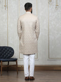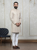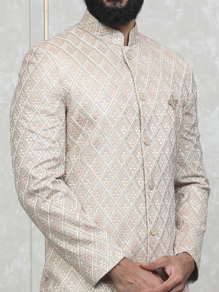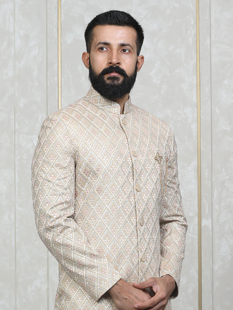 Khaki Vichitra Silk Embroidered Sherwani Set