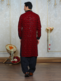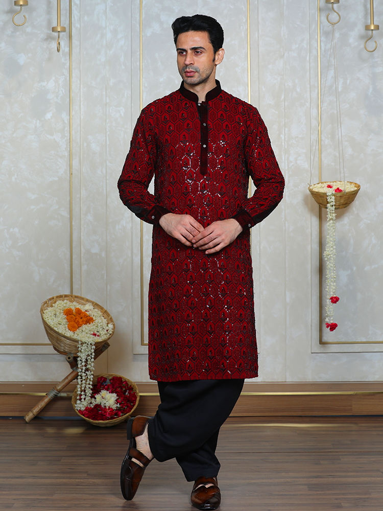 Mehroon Georgette Cutdana Work Kurta Set for Men