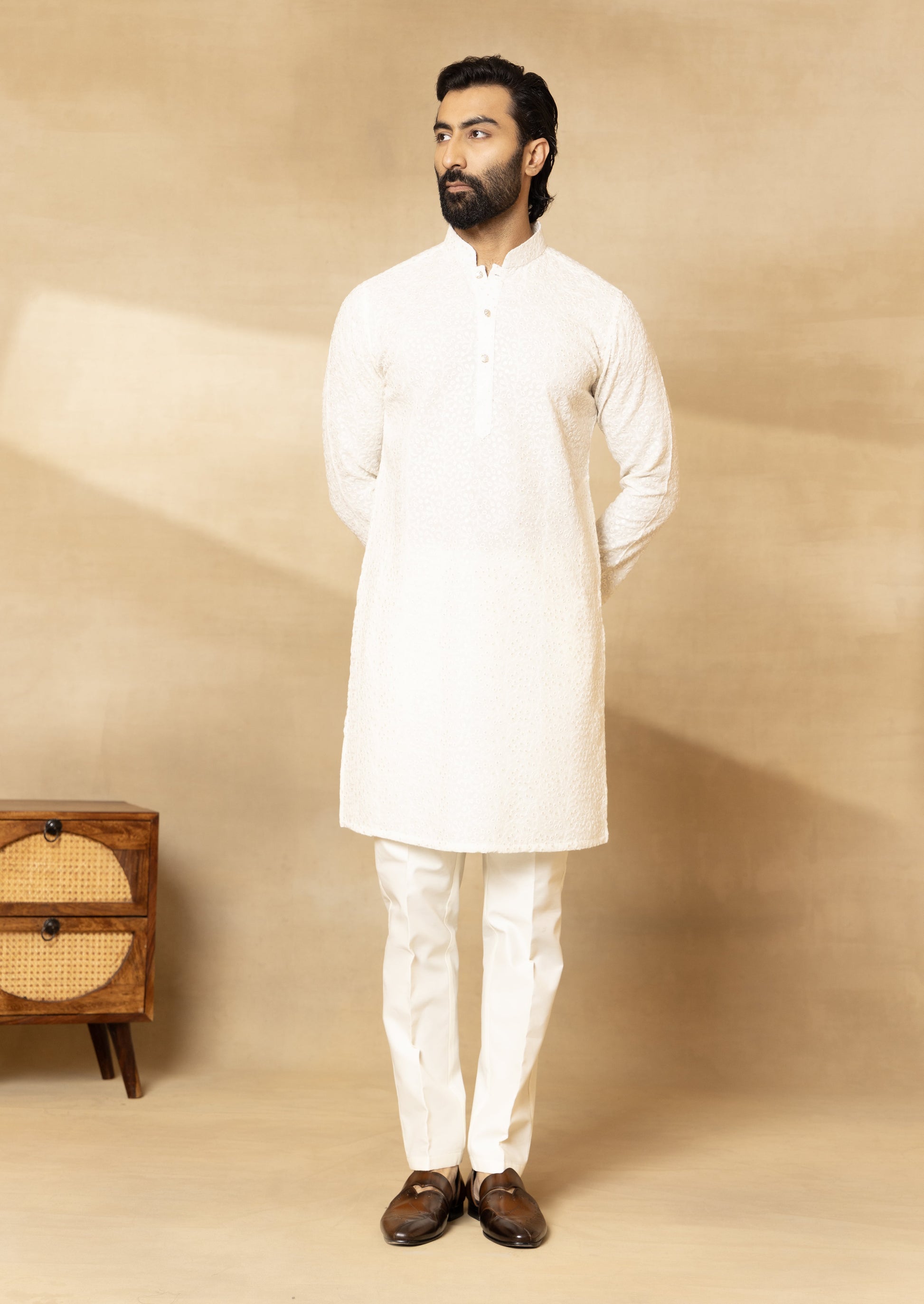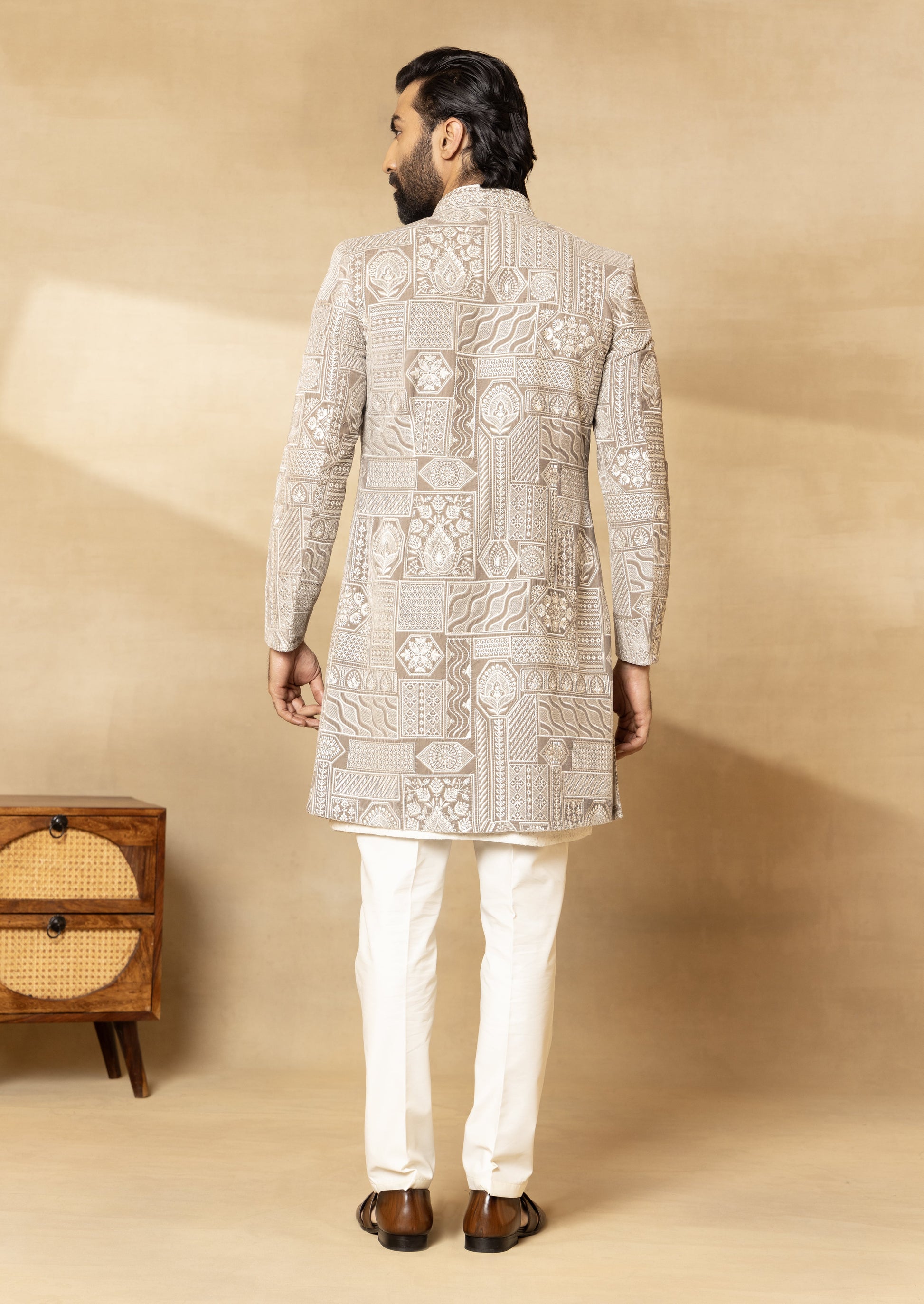 Natural Grey Velvet Embroidered Front Open Sherwani Set