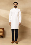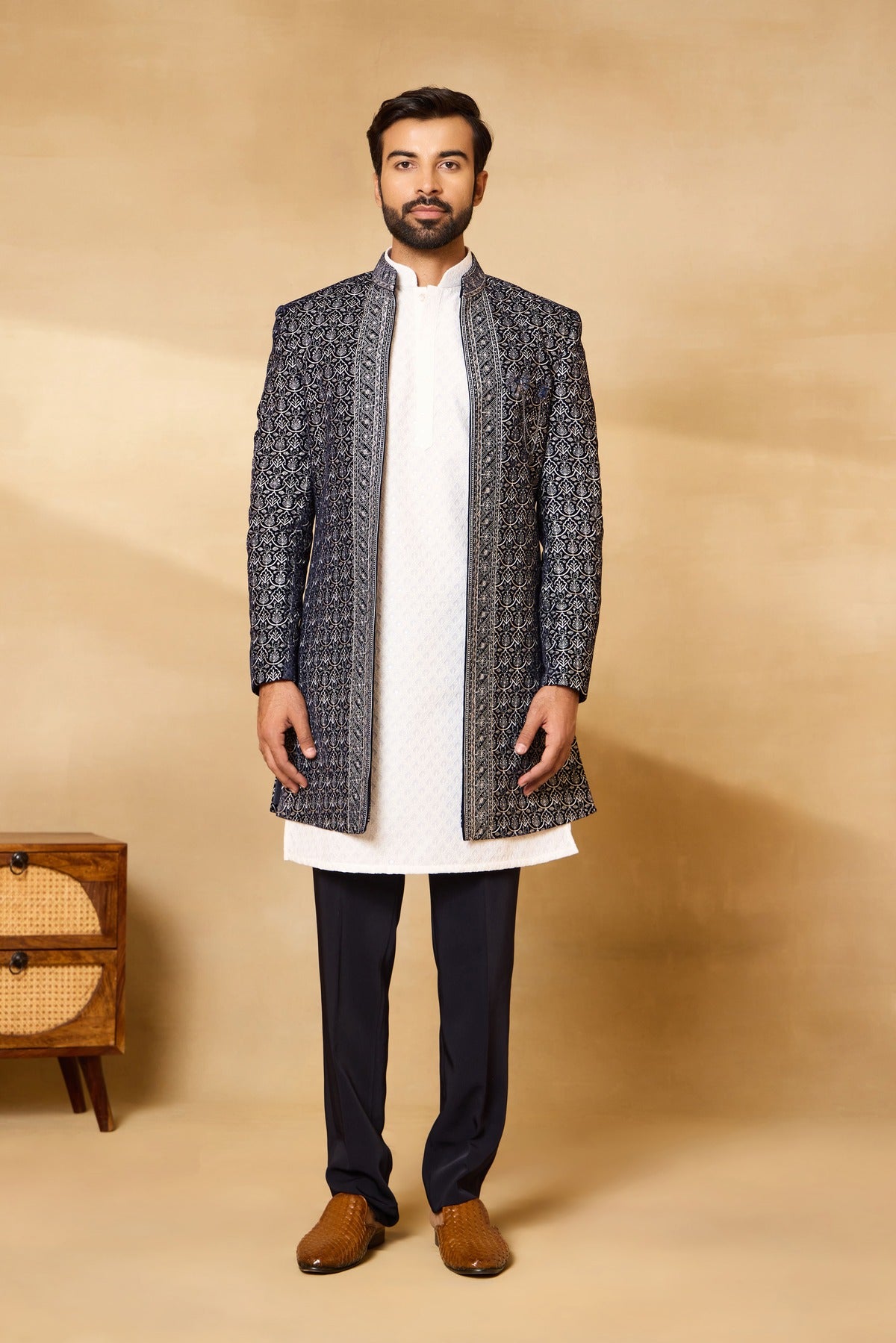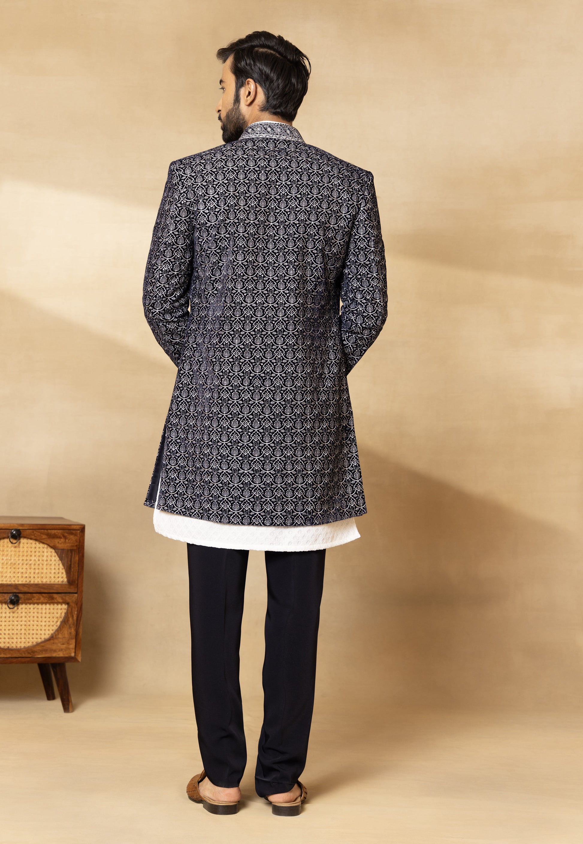 Navy Blue Front Open Long Jacket Set with Chikan Kurta