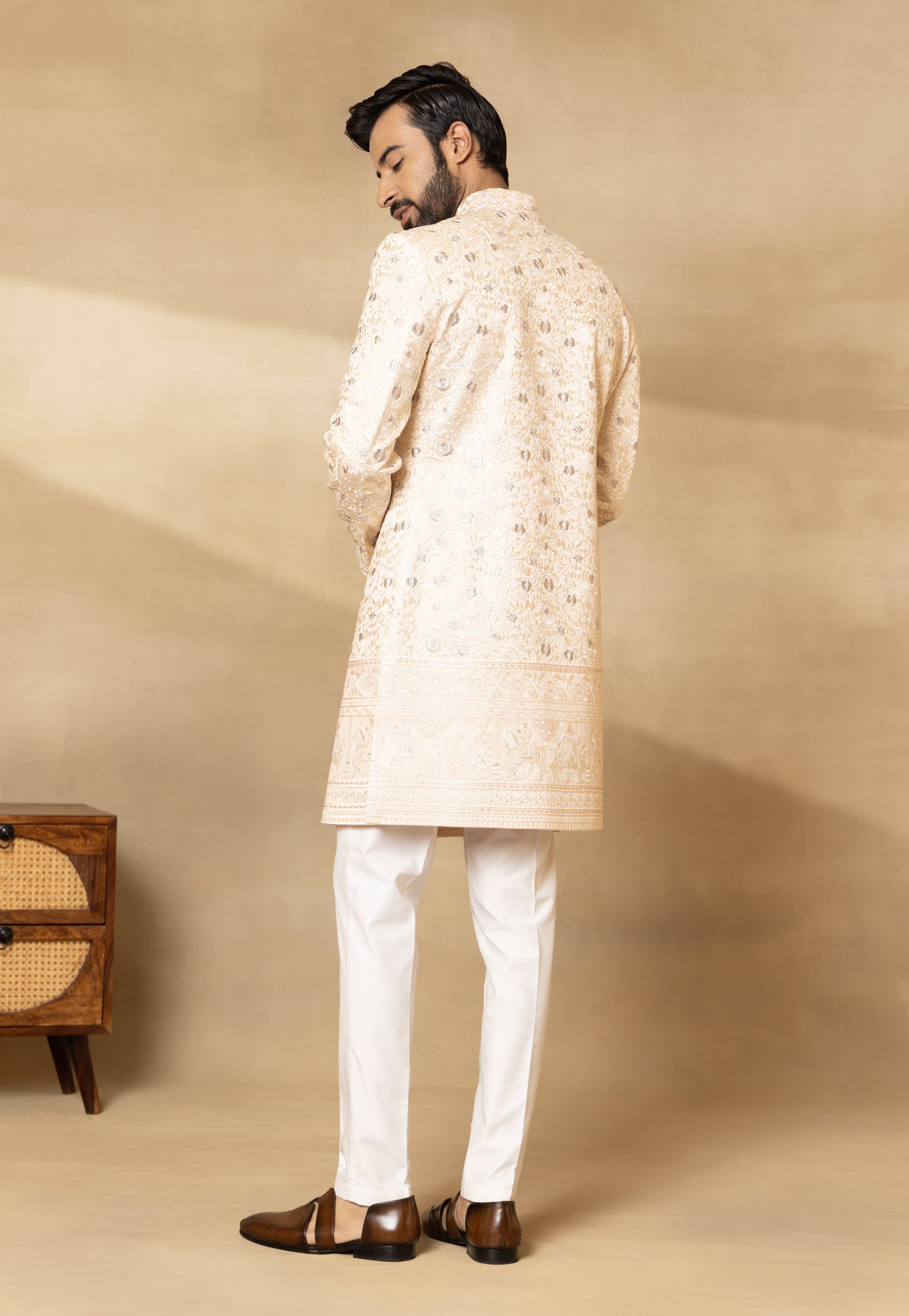 Components: 4 Colour: Peach Fit: Regular Fit Neckline: Mandarin Collar Sleeve: Full Sleeves Fabric: Camery Silk; Trouser- Cotton Silk; Dupatta- Camery Silk Elements: Embroidered Sherwani; Embroidered Camery Silk Dupatta; Embellished Buttons; Bespoke Brooch; Regular Fit Trouser. Care: Dry Clean Only. Steam Iron Only. Do Not Wash. (Possibility of slight colour variation)