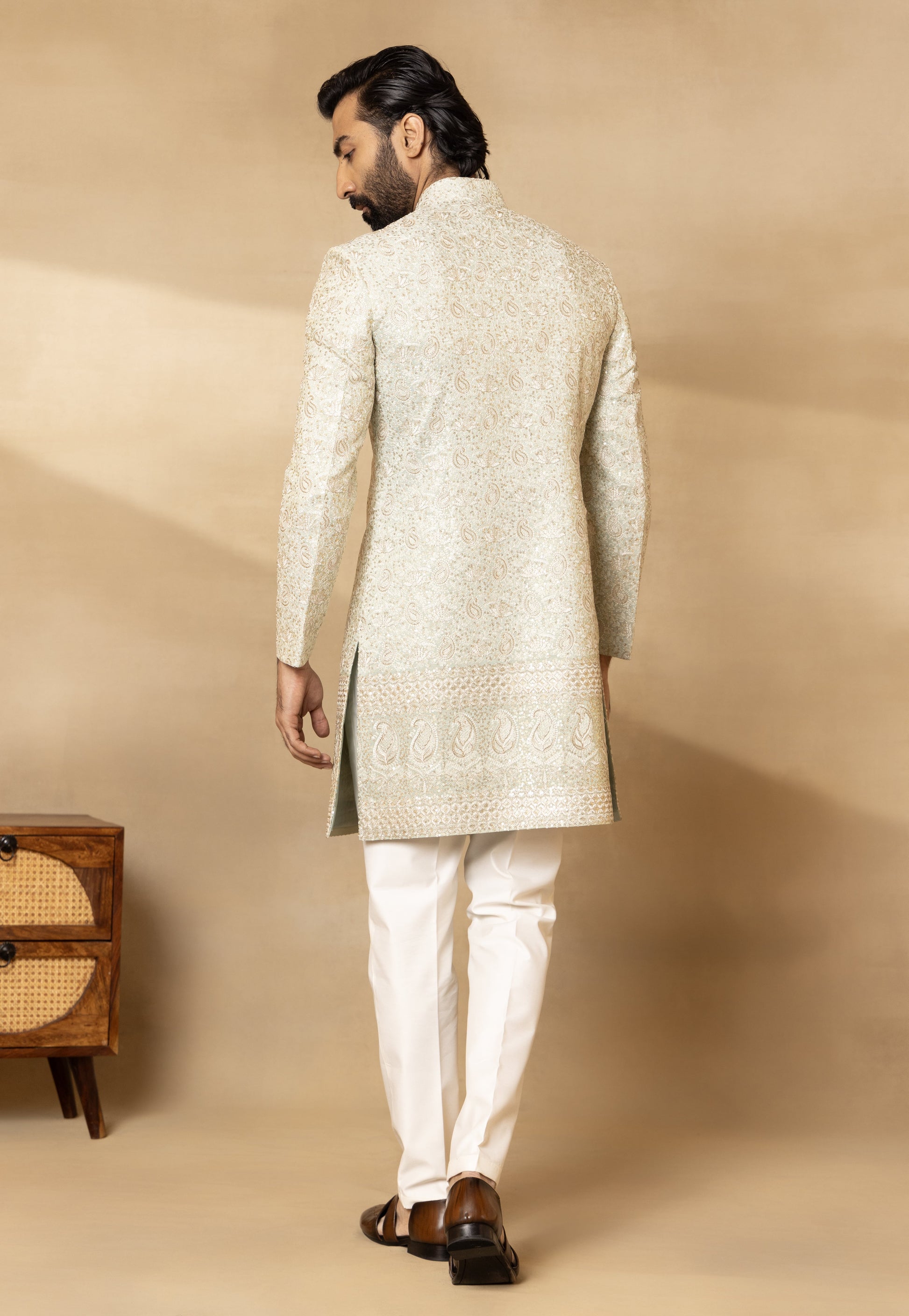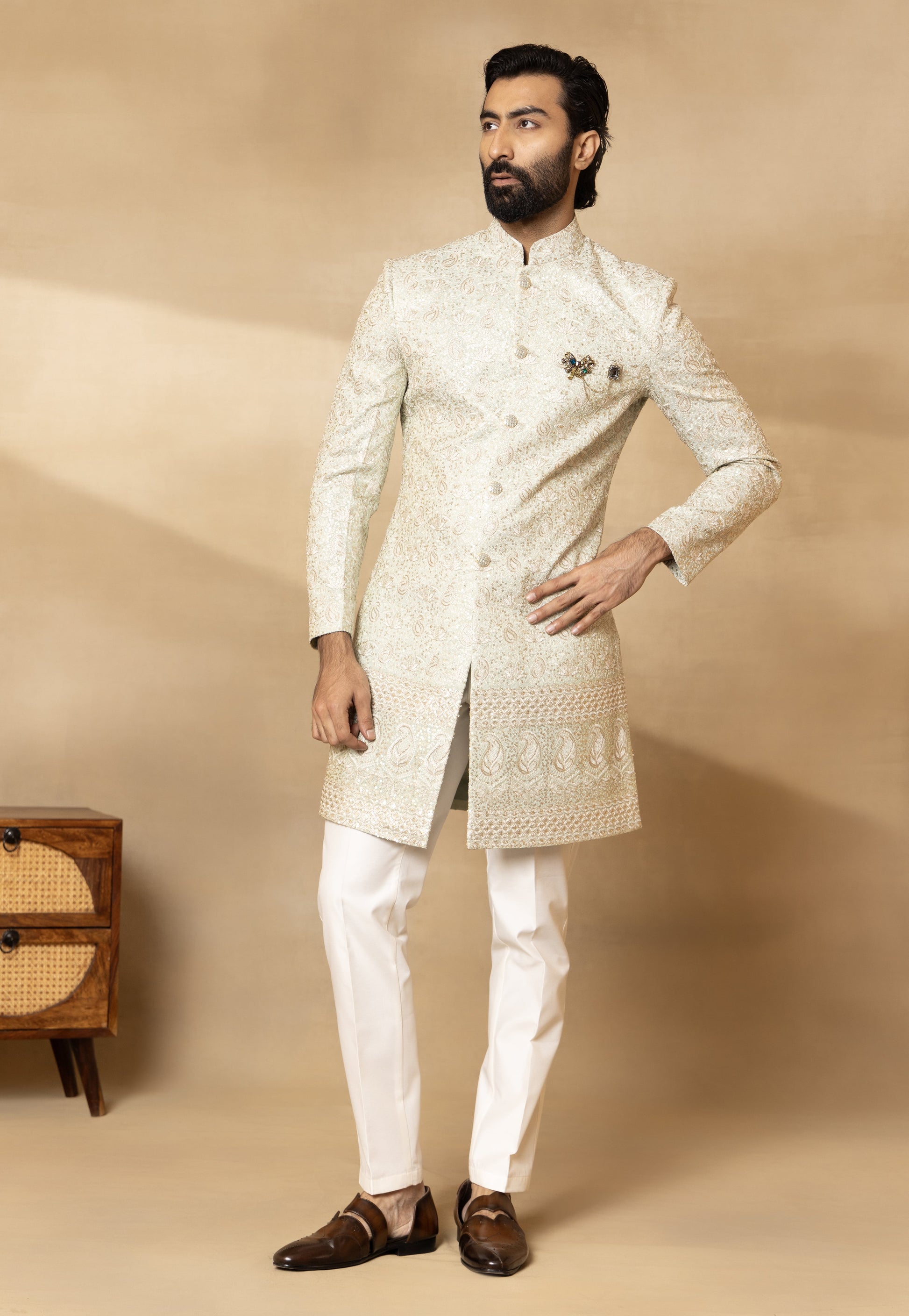 Components: 4 Colour: Pista Green Fit: Regular Fit Neckline: Mandarin Collar Sleeve: Full Sleeves Fabric: Tissue Silk; Trouser- Cotton Silk; Dupatta- Tissue Silk Elements: Embroidered Sherwani; Embroidered Tissue Silk Dupatta; Embellished Buttons; Bespoke Brooch; Regular Fit Trouser. Care: Dry Clean Only. Steam Iron Only. Do Not Wash. (Possibility of slight colour variation)