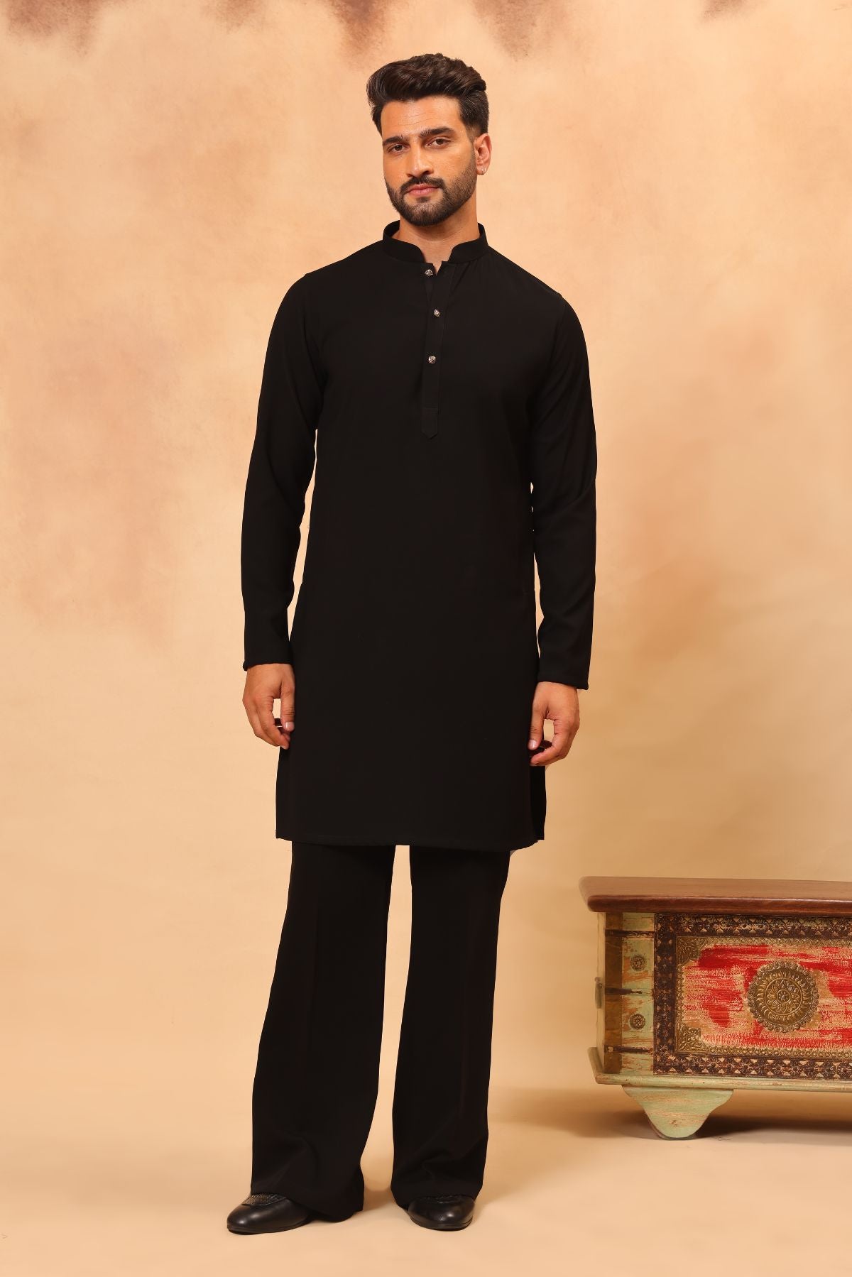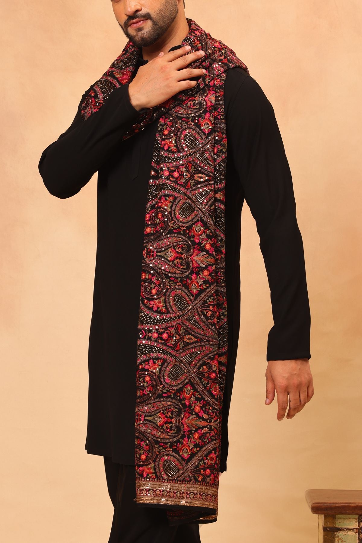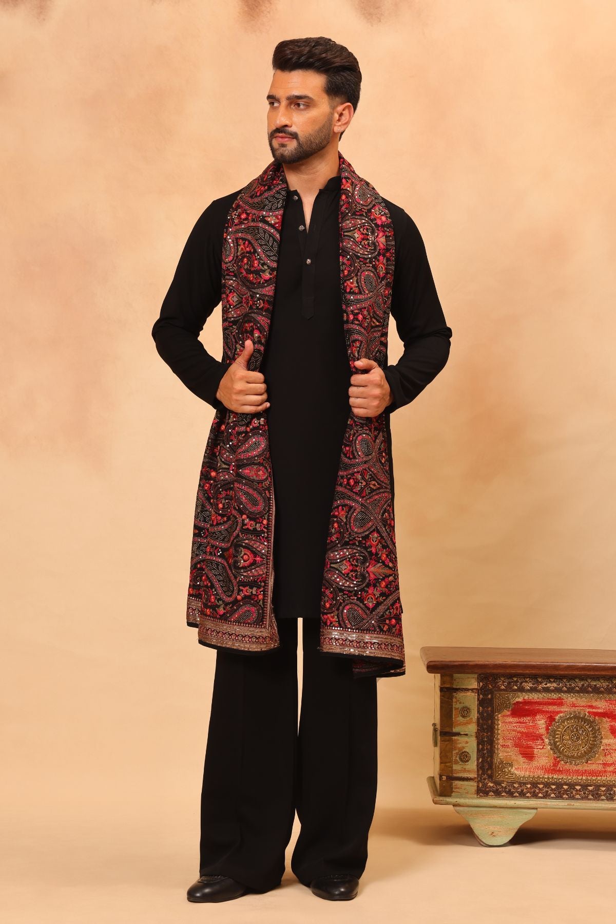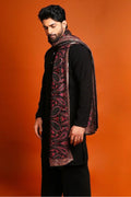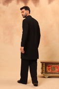 Plain Black Kurta Set with Heavy Embroidered Dupatta for Men
